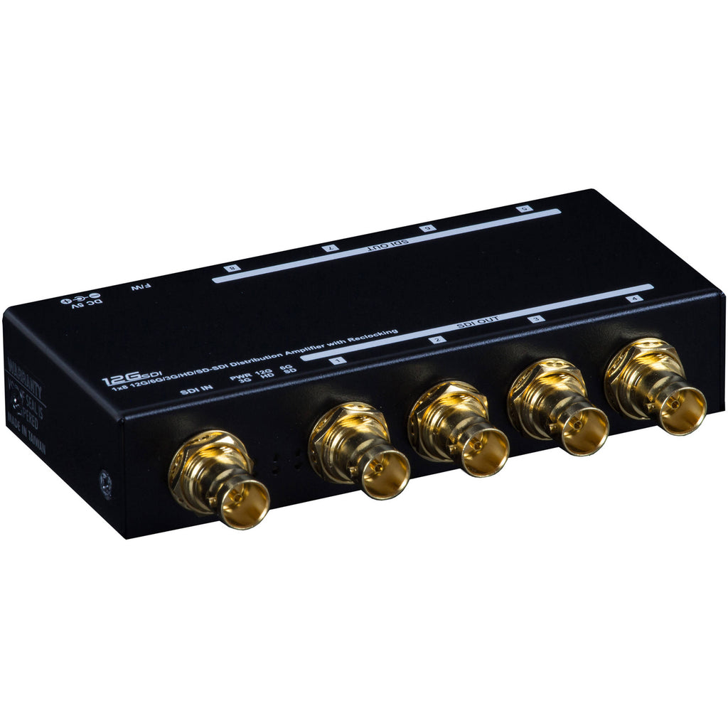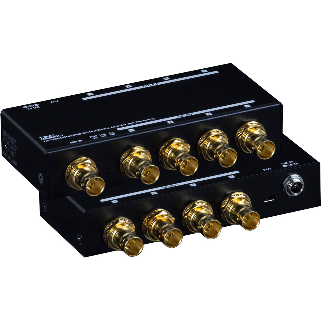 The MuxLab 4K60 12G-SDI 1 x 8 Splitter allows one 12G/6G/3G/HD/SD-SDI source to be distributed and amplified to up to eight 12G/6G/3G/HD/SD-SDI displays. The splitter supports up to UHD 4K video and HD audio, including 480i (SD-SDI), 720p/1080i, 1080p, 4K30, and 4K60. The device automatically detects the 12G/6G/3G/HD/SD-SDI signal and reclocks and regenerates the signal at the output for extending distances between source and displays. Integrated LED indicators display signal information.