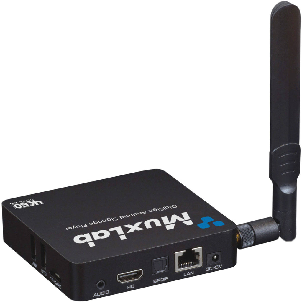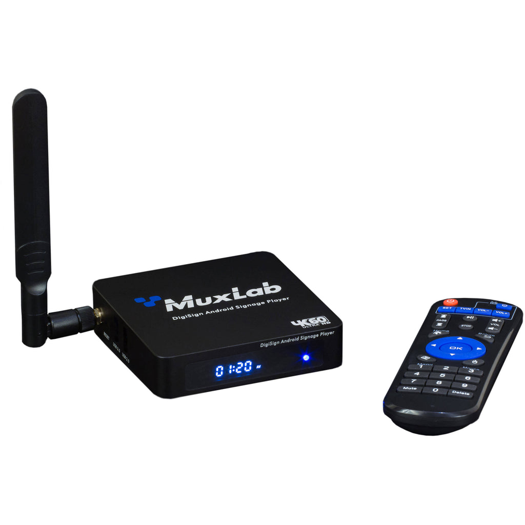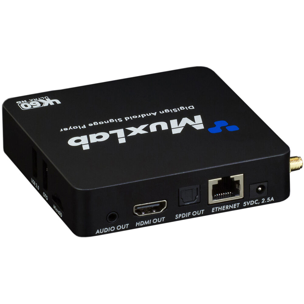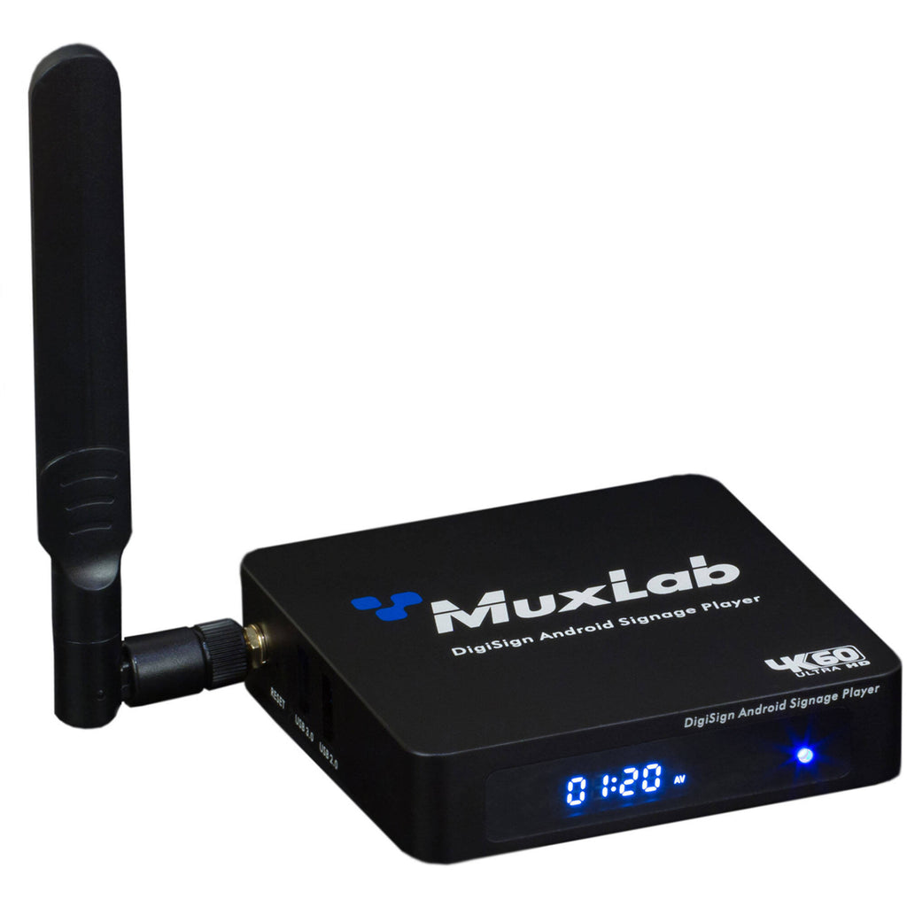 Input up to 4K60 video signals and output them on digital signage or stream to the internet with this DigiSign Android Signage Player from Muxlab. This digital signage media player can be used with commercial or residential AV systems such as corporate lobbies, malls, and airports to display high-definition video on signs and displays. The player supports multiview output and scheduling, multiple video, audio, and image file formats, and it delivers content to multiple displays, a virtual matrix, and video wall configurations.