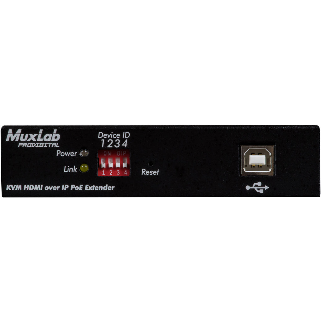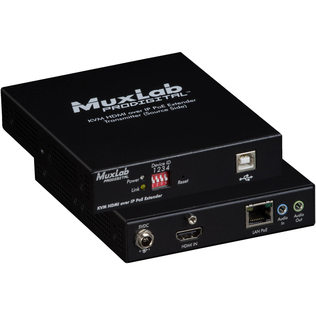 Transmit 4K60 video with companion KVM commands up to 328' away with the UHD 4K KVM HDMI-over-IP PoE Extender Transmitter from MuxLab. The transmitter can transmit video directly to the separately available 500772-RX receiver on a local LAN, and it is powered via PoE on a supported network or by an optional power supply. The transmitter will fit right into your IT server room, media center, meeting room, or classroom environment where video distribution and central keyboard control is used.