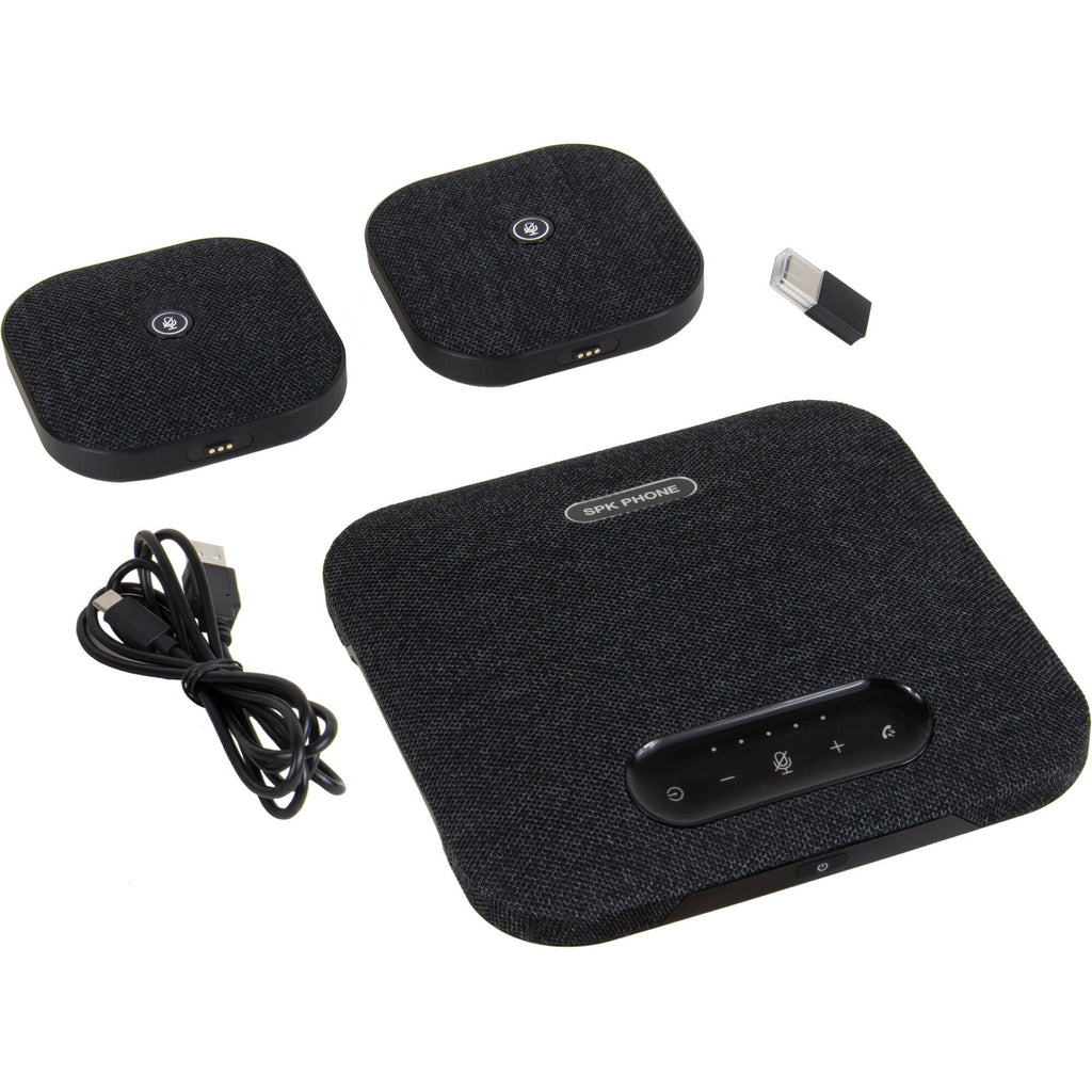 When you're in a larger space, you can utilize the two extension mics to maintain sound quality. The speakerphone plugs into a macOS, Windows, or Android computer using a USB connection, and an optional wireless USB connector is available separately. Each unit runs on an internal battery that lasts up to 10 hours.