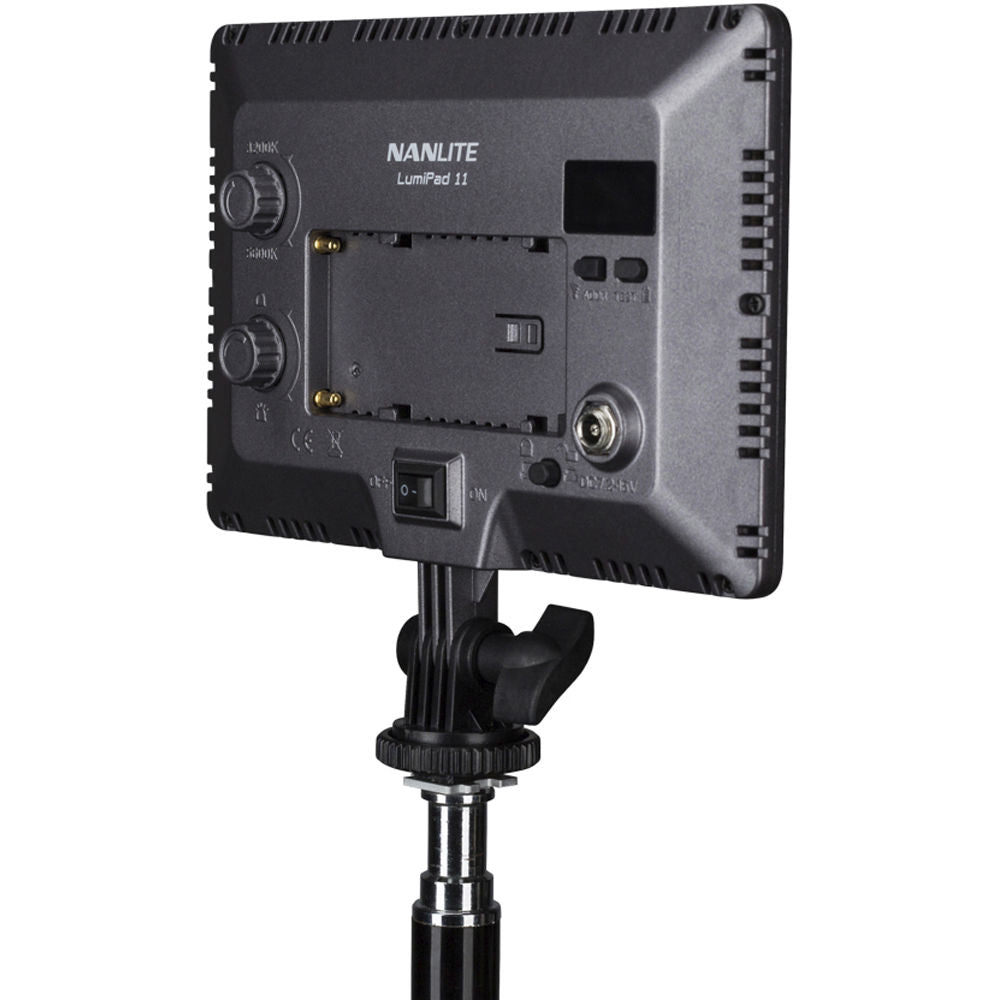 Handy for use on or off-camera, the LumiPad 11 Bi-Color Soft LED Panel from NanLite is a versatile 6.5 x 4.5 x 1.4" light source with solid control features at a price point that makes it a good choice for both part-time and full-time shooters. Its wide beam spread, and soft output are well-suited for portrait, wedding, group video, and photography, while its thin 1.4" profile allows placement where larger lights can't go. The light has color that's CRI-rated at 95 for accurate rendering and variable from 3200 to 5600K to meet any ambient light challenge or to blend in seamlessly with other fixtures. Light intensity is variable from 0 to 100%, while the fixture's quiet air-cooling is an asset, especially in sound-sensitive situations. The LumiPad 11 is ready for worldwide use via an optional 110-240 VAC power adapter, but it can also run on separately-purchased batteries when mains power is unavailable via its NP-F battery plate.