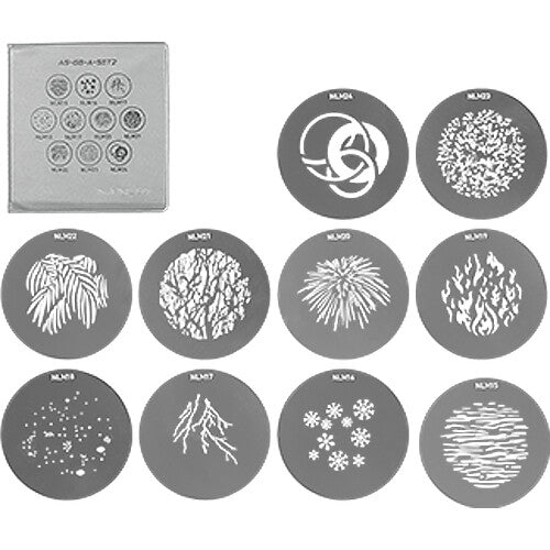 This NL Mount Projection Attachment Gobo Set 2 from Nanlux is a collection of 10 gobo discs that are fully compatible with the separately available Nanlux 15-30° projection attachment. This kit includes natural options for water, trees, and foliage, as well as flames, fireworks, graphical patterns, and more. Each gobo can be inserted into the NL mount projection attachment's gobo holder. Use them to create compelling backgrounds and creative lighting effects.