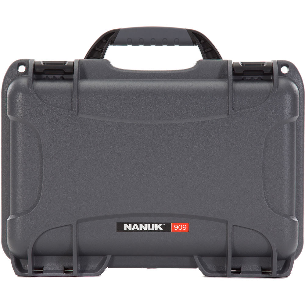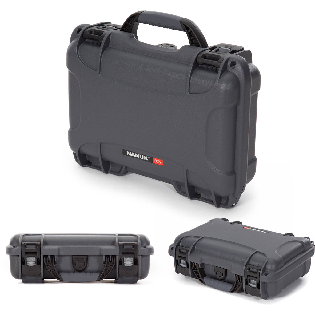 Store, protect, and transport your valuable photo, electronic, or other gear with the waterproof and dust-proof graphite 909 Case without foam from NANUK . The case features PowerClaw latches, and holes for optional user-supplied padlocks provide secure closure. Users will appreciate the strong NK-7 resin construction, automatic pressure release valve, integrated lid stay, and large folding soft-grip handle. The 909 case is stackable with same-size cases.