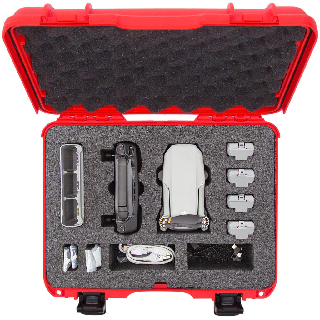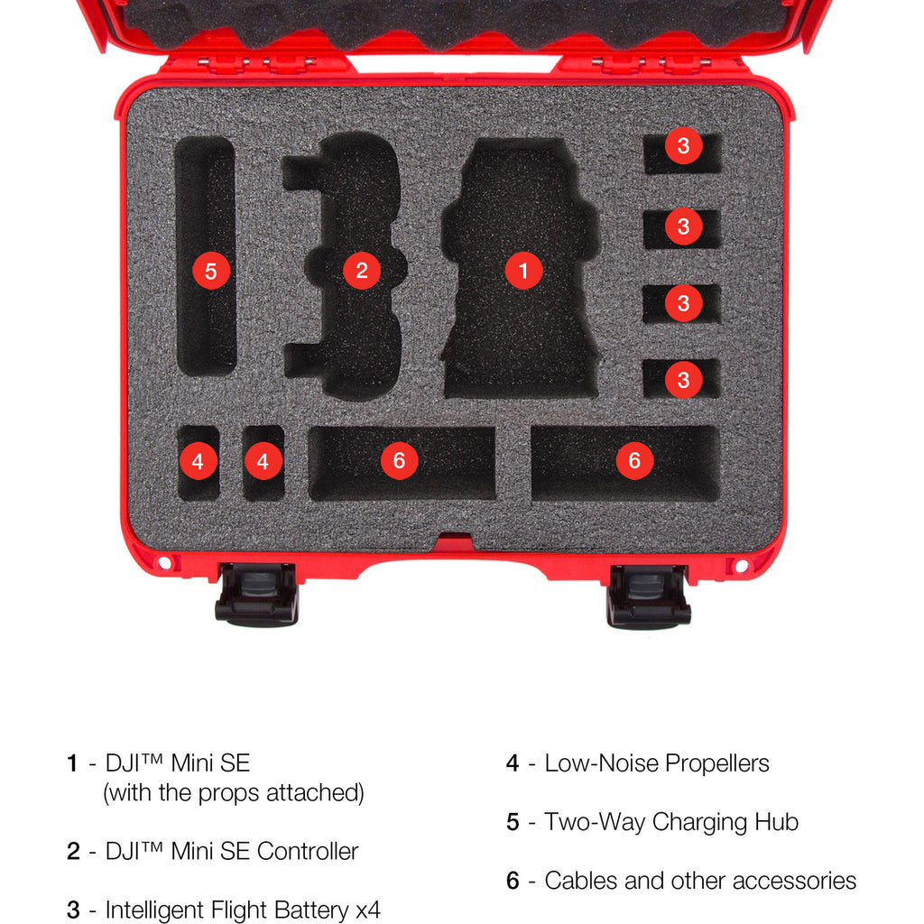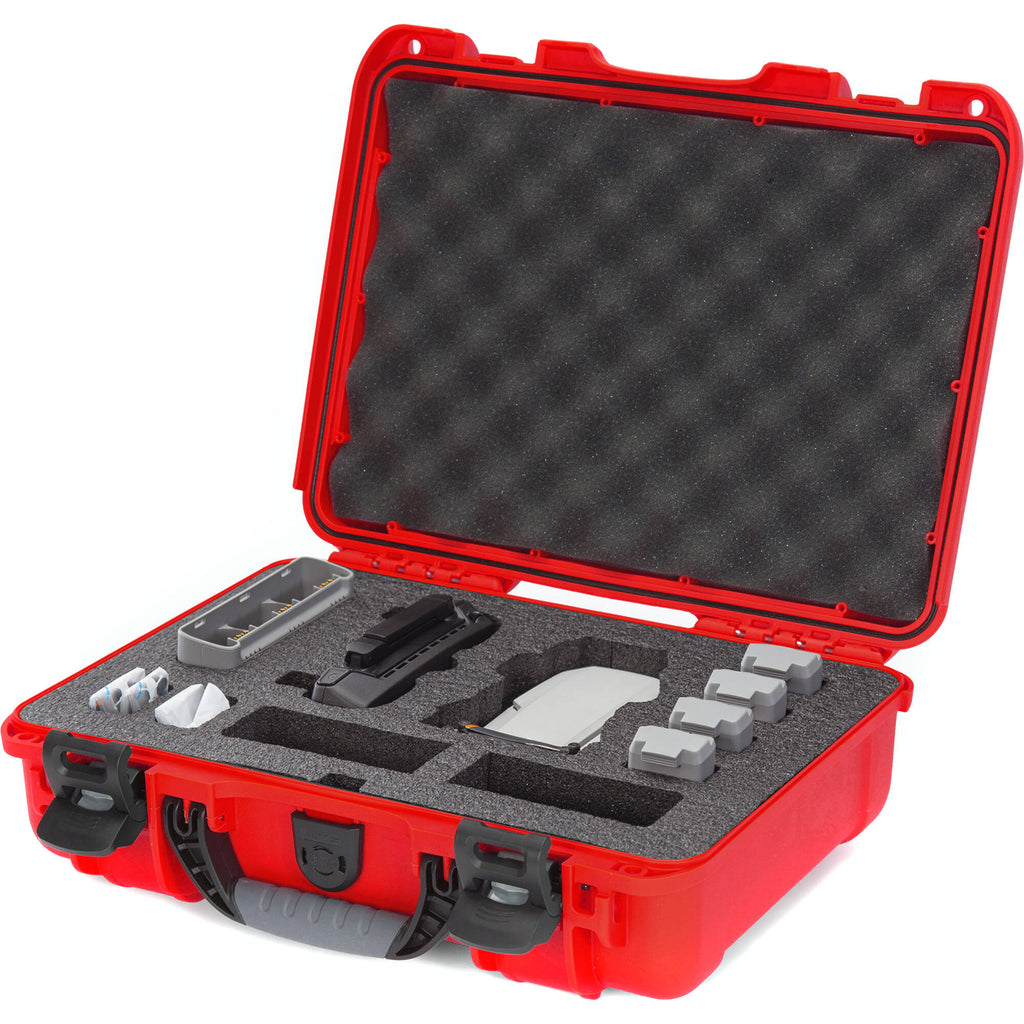 Store, protect, and transport your DJI Mavic Mini SE drone with the Fly More Combo accessory kit using this waterproof and dustproof red 910 for DJI Mini SE Fly More Kit from Nanuk. The 910 case features a custom-cut foam interior and an egg crate foam piece for the inner lid.