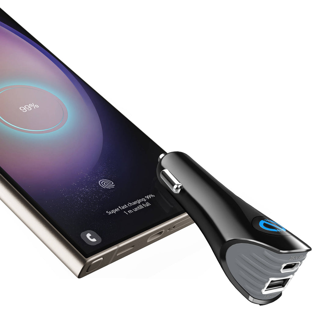 Day or night, conveniently recharge your mobile devices while driving when you have the SpeedMax25 25W 2-Port USB Car Charger from Naztech. The charger fits into your vehicle's power port and has a soft-glow LED that makes it easier to plug your phone or tablet into each port when it's dark. The ports consist of a single 25W USB-C PD and a 12W USB-A port. Together, they allow fast simultaneous charging with the built-in IntelliQ smart chip and PPS technology, which allocates power to work with each device's capabilities. OmniProtect technology is also used to shield devices from damage due to short circuits and excess voltage, charge, or temperature. As an added bonus, a 4' USB-C cable is included to get you started right out of the box.
