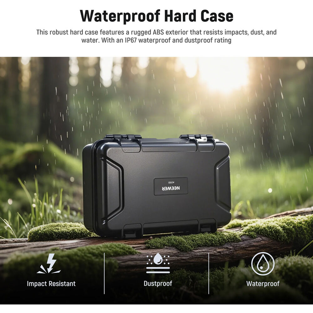 Providing durable protection, the AC022 Waterproof Hard-Shell Case from Neewer is a secure way to store and transport your DJI Osmo Pocket 3 Creator Combo and additional accessories. The case has an impact-resistant, hard-shell exterior made from durable, lightweight ABS plastic a latch system that provides IP67-rated water and dust resistance. It can be carried via the integrated handle or the included lanyard with carabiner.