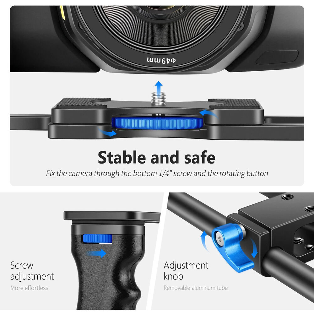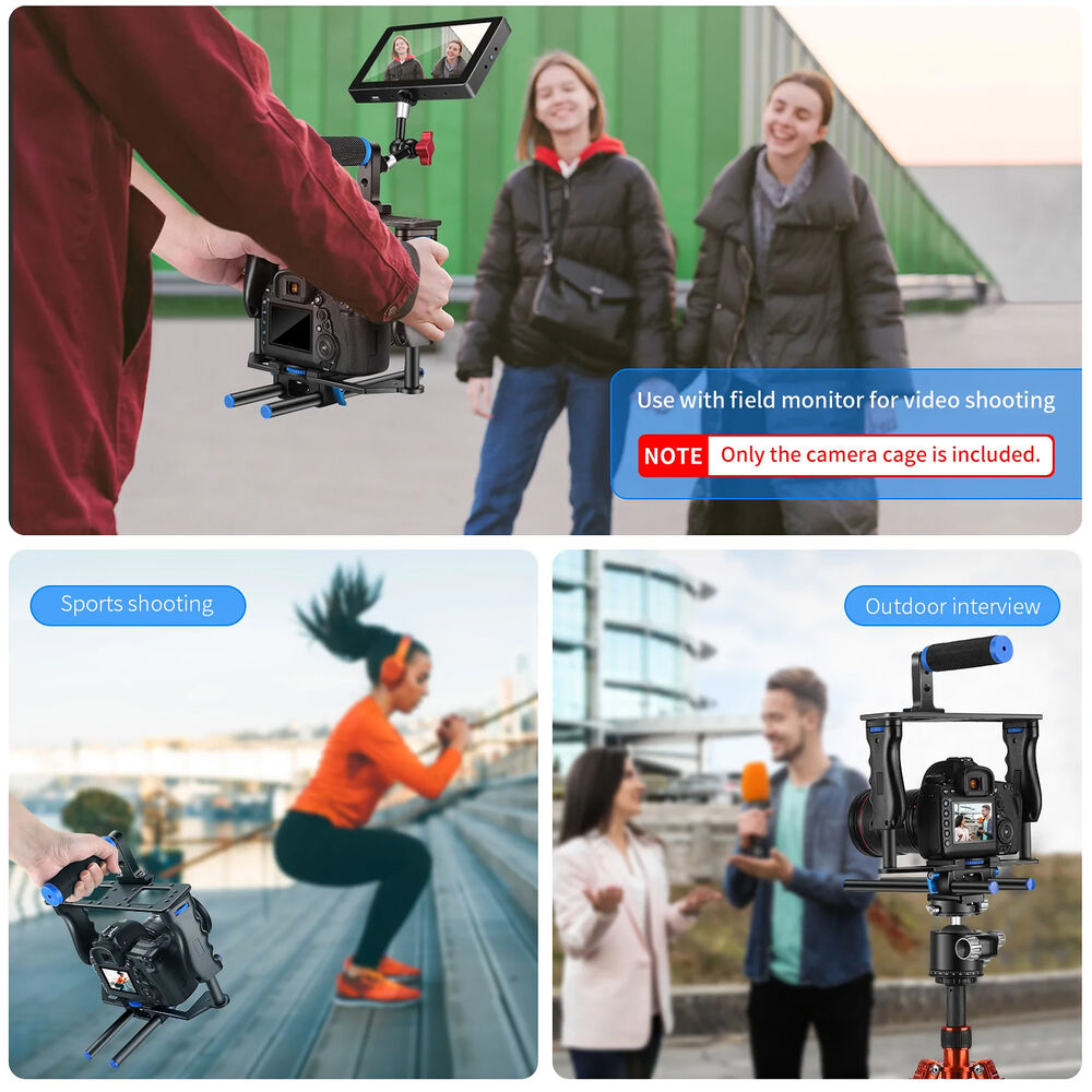 Protect and customize your camera rig with this black and blue Camera Cage Kit from Neewer, ideal for photographers and filmmakers. The camera cage has dual handgrips for stability during your shootings. Additionally, a silicone top handle can be attached to the camera cage for low-angle shots. The integrated dual-rod base features two 15mm rods and a 60mm rod rail gauge that allows you to adjust the camera in different positions and mount accessories such as a follow focus, sun hood, or lens support.