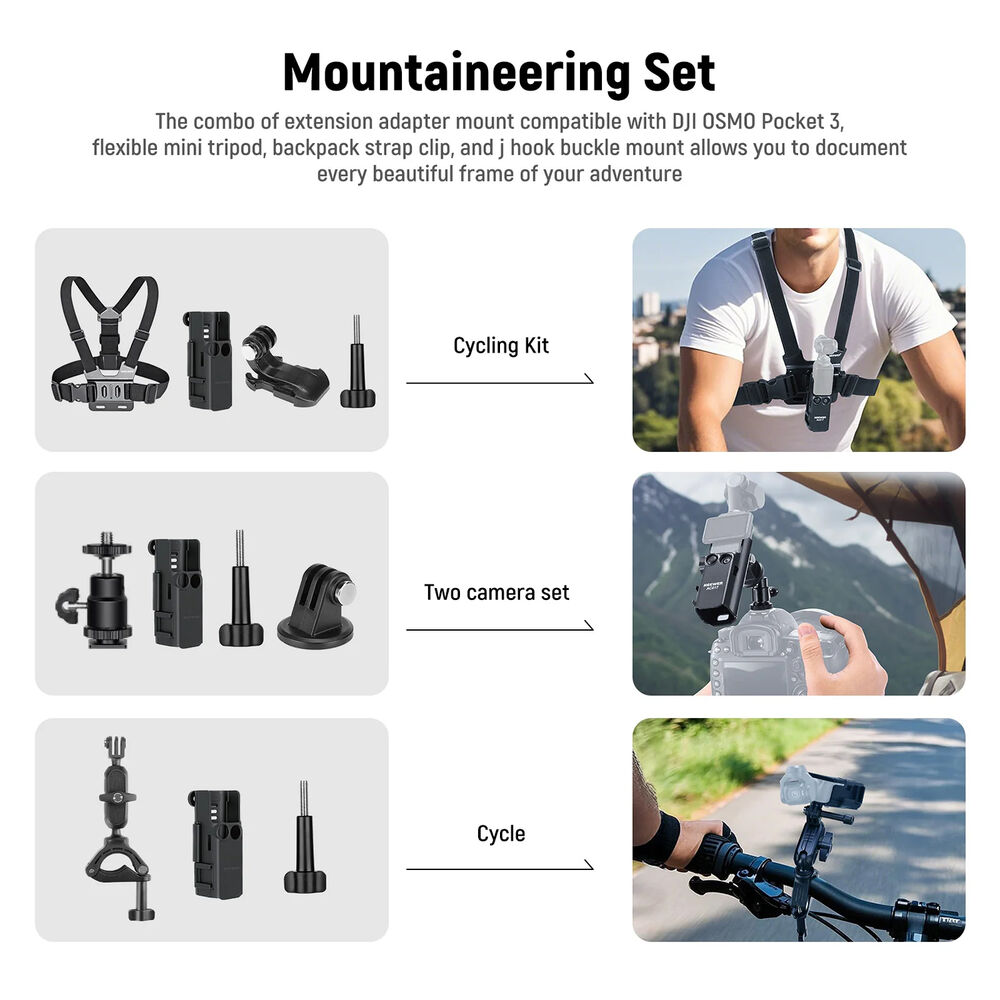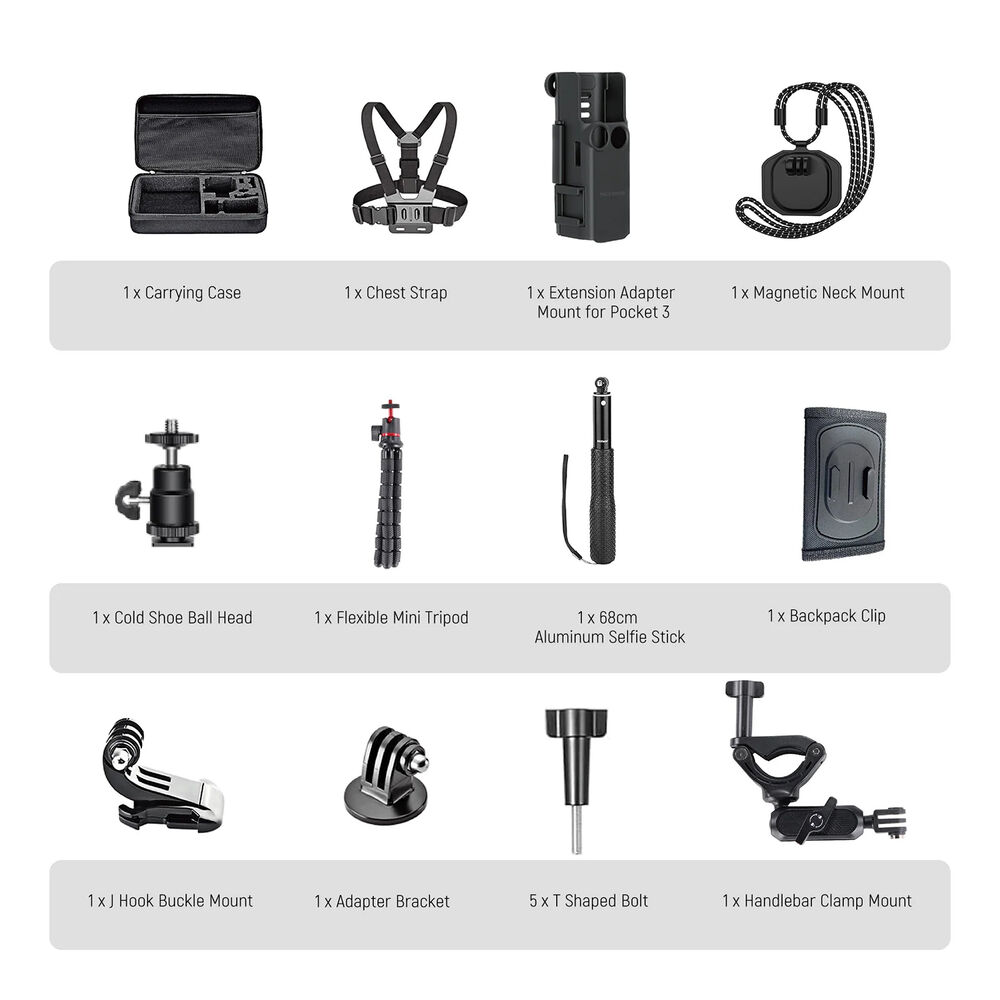 The GP-52 Multifunctional Accessory Kit from Neewer is designed for compatibility with the DJI Osmo Pocket 3. The 16-in-1 accessories kit comprehensively bundles everything you need for a wide range of outdoor action activities, such as mountaineering and vlogging. It provides a multitude of setup options, including first-person POV, cycling kit for action shots, and more. It comes with a carrying case to keep all the accessories together and neatly organized for transport.