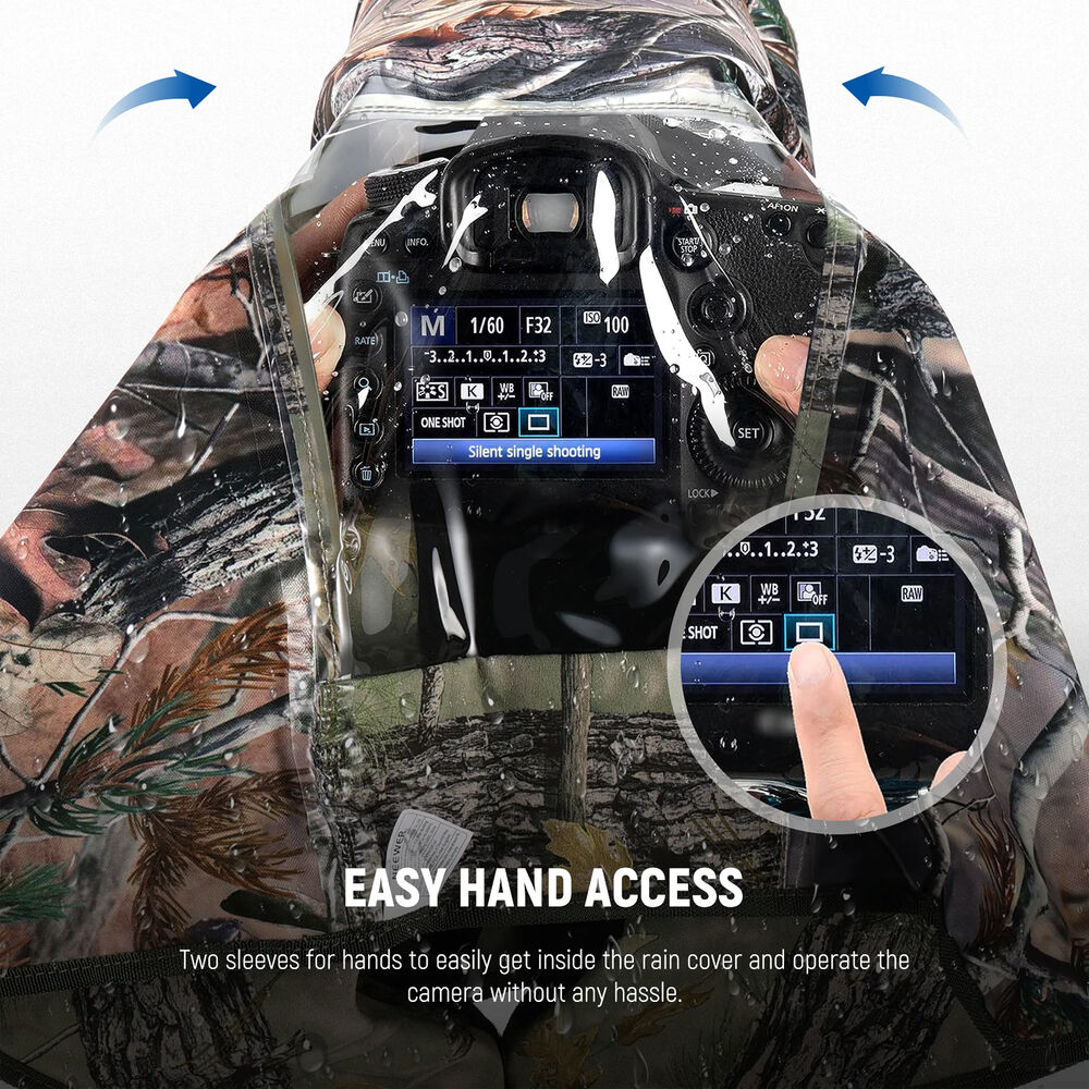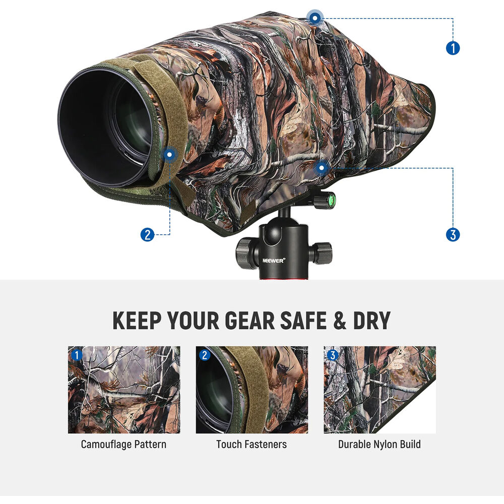 Protect your camera from inclement conditions with the large PB021 Dual-Sided Camouflage Rain Cover from Neewer. This water-resistant nylon cover has a dual-sided camouflage pattern to conceal your camera and lens when out in the wilderness. One side has a brown camouflage pattern and the other side has a green camouflage pattern. Openings on either side allow quick and easy access to your camera controls while a clear window lets you see your LCD screen and camera controls. This cover easily stows away in the included case.