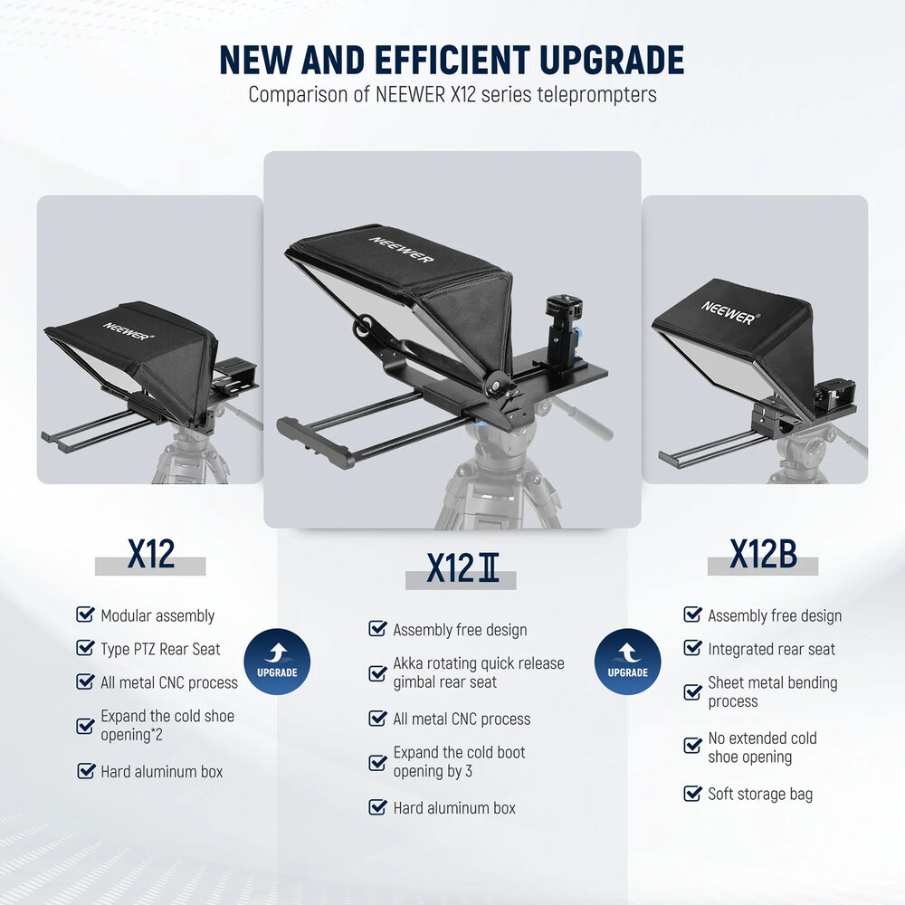 The X12II Tablet Teleprompter from Neewer turns your tablet or smartphone into a teleprompting device to create scripted content with your DLSR/mirrorless camera. The teleprompter's integrated clamp supports tablets and smartphones up to 7.8" wide and the camera mount supports camera rigs weighing up to 22 lb.
