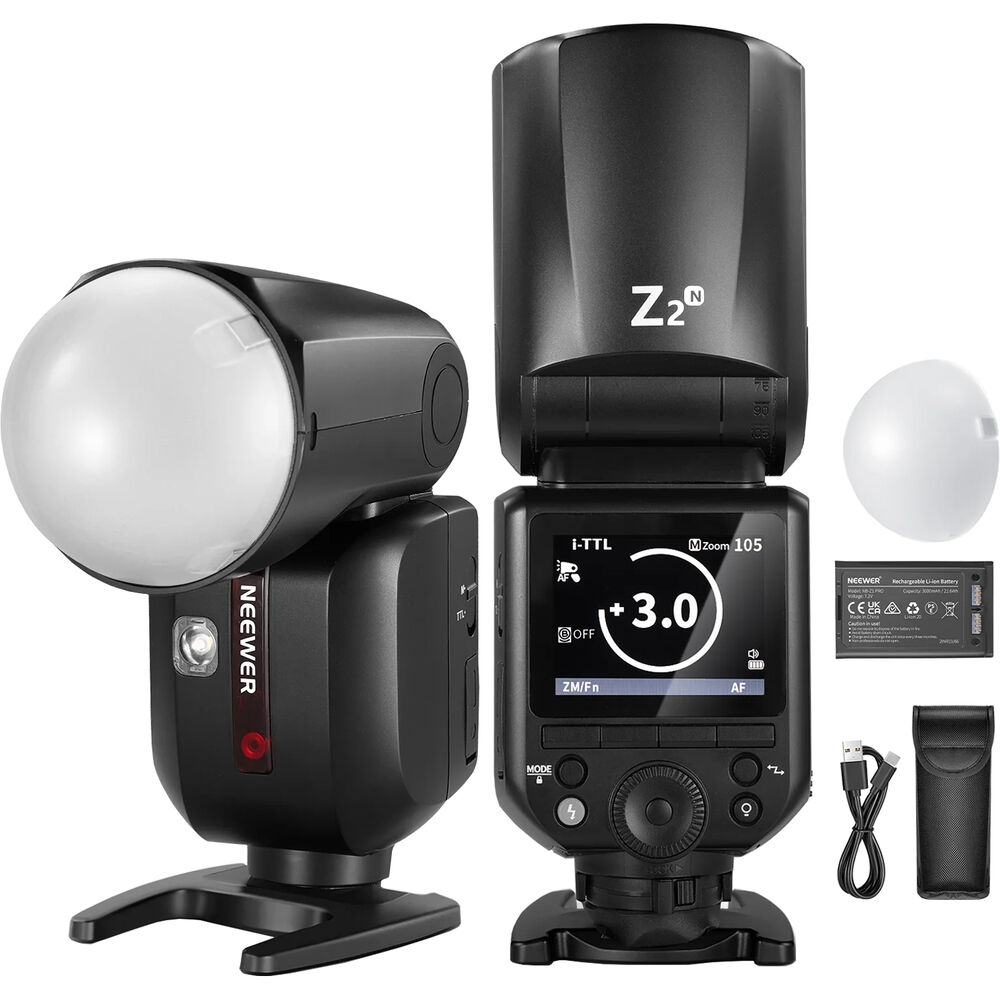 Neewer continues to expand its shoe-mounted flash lineup with the Z2-N TTL Round Head Flash Speedlite for Nikon Diffuser Kit. Offering the same powerful 76Ws output of its predecessor, as well as 600 full-power flashes and a fast recycle time of 1.5 sec, this second generation of the flash provides not only one, but two built-in LED modeling lights. They can help you previsualize where the light is falling on your subject by observing highlights and shadows. If you need to quickly switch from TTL to manual flash mode, the Z2-N's TCM conversion function is the key. This capability helps you find the proper exposure value without the need of a separate meter. Finally, an upgraded rear panel illuminates your flash settings. Start lighting your photoshoots with this easy-to-use flash with enhanced features and build quality. This version includes a magnetic dome diffuser that softens the light.