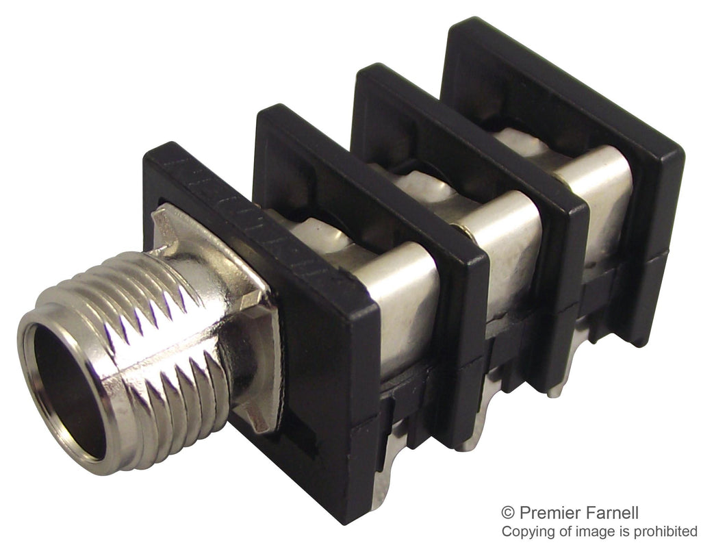 The NRJ6HM-1 is a 3-pole 6.35mm stereo Slim Jack with silver-plated contacts and metal threaded nose. Horizontal PCB mount.