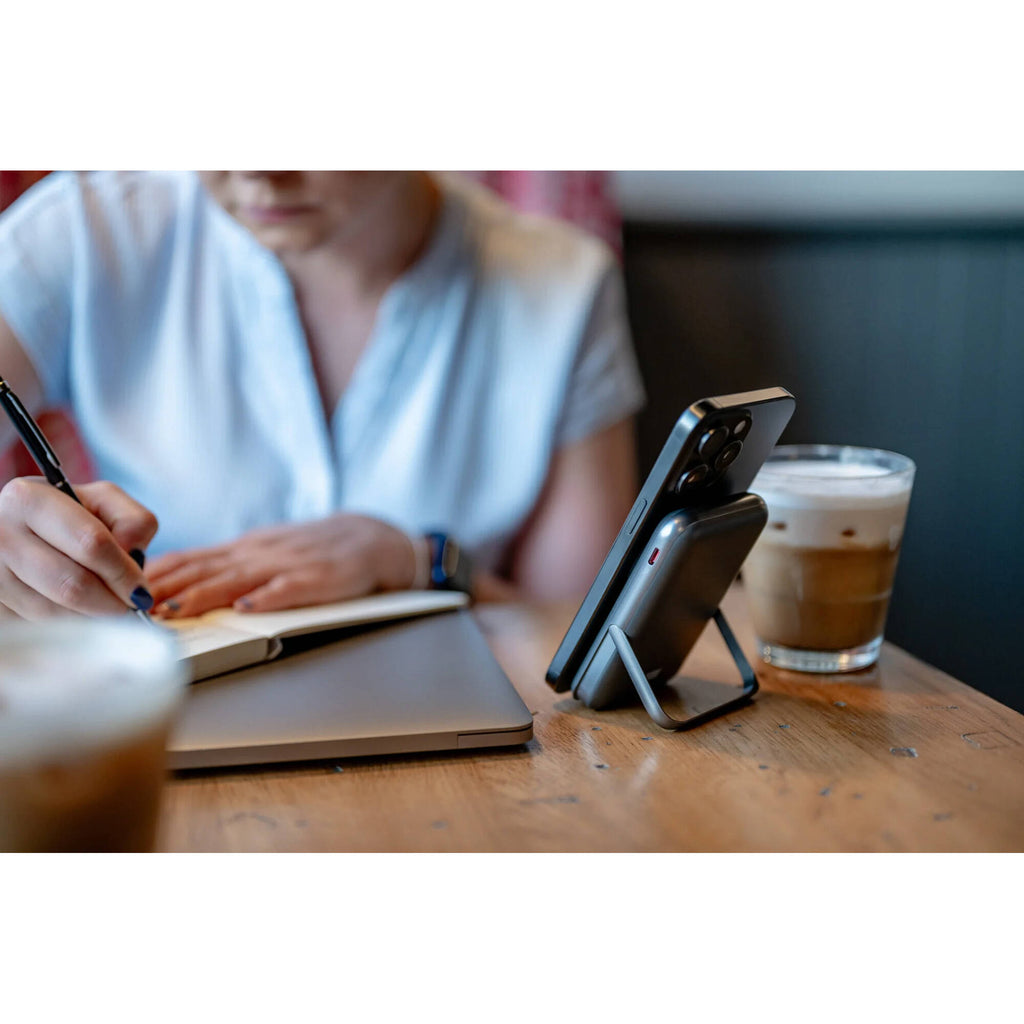 Keep your devices charged while on the go with the MS-10000 10,000mAh MagSafe Power Bank from Newell. Featuring MagSafe wireless charging, this slim power bank supports up to 15W of wireless charging to compatible iPhones. Additionally, a USB-C port provides 20W of wired fast charging for devices like Android smartphones, cameras, wireless headphones, eBook readers, and more. An integrated foldable kickstand supports your device and can keep it propped up at a 45? angle for watching videos or taking video calls.
