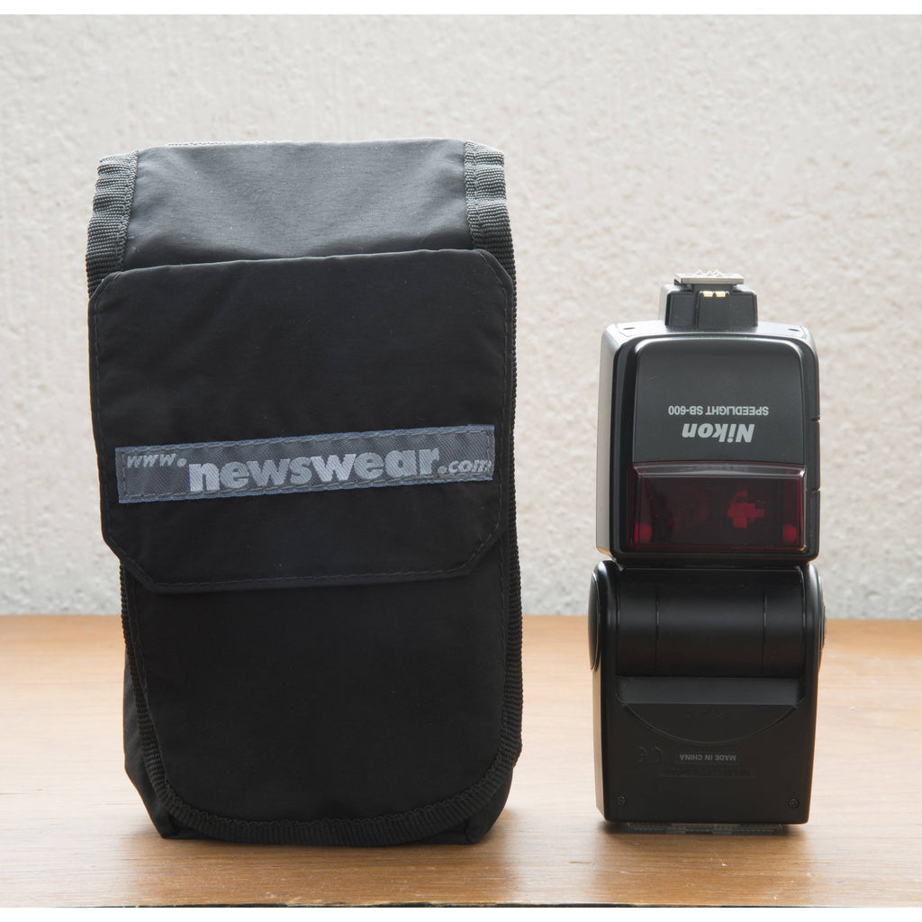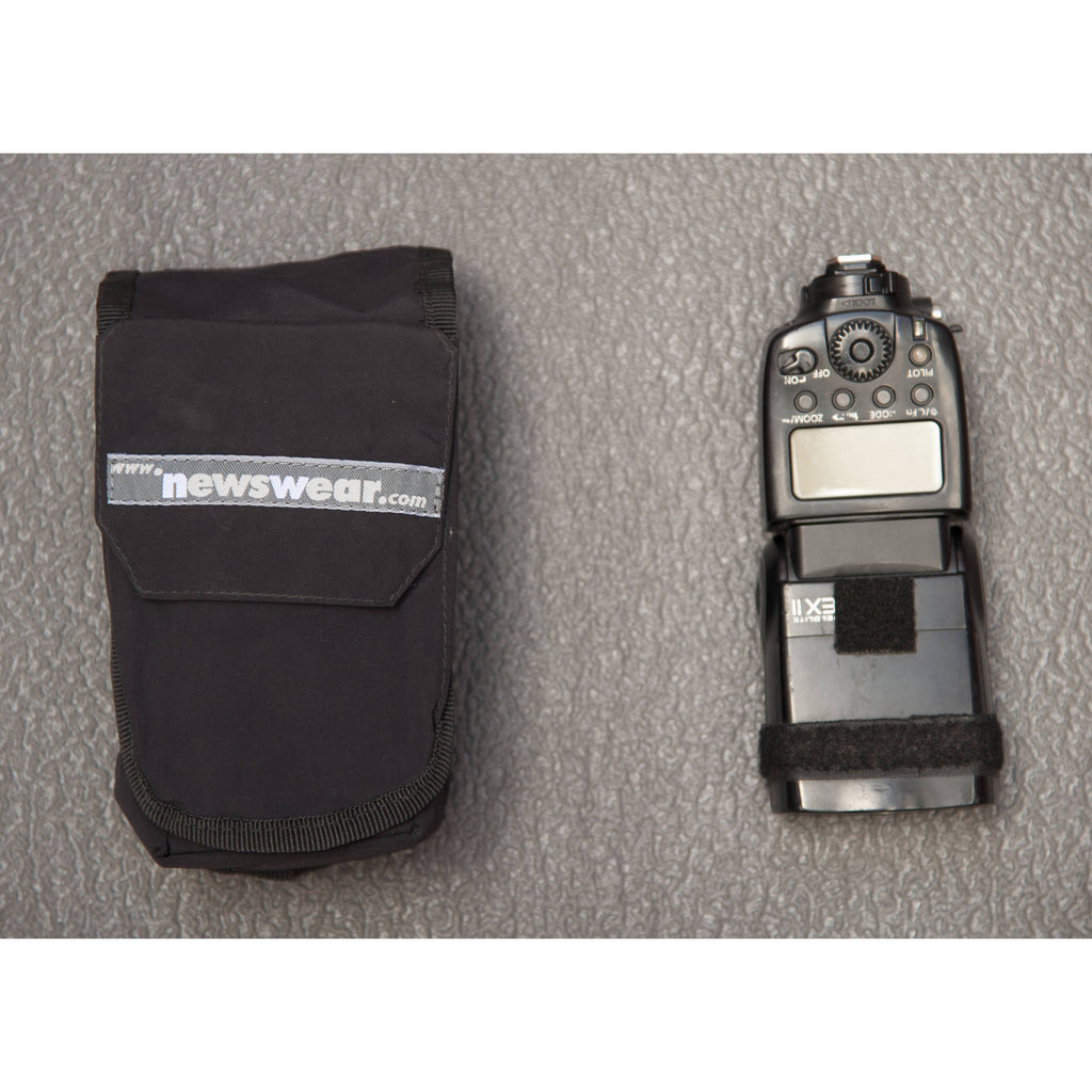 Store, transport, and protect a select speedlight strobe or accessory from wet weather with the black Strobe Aqua Pouch from Newswear . The pouch is assembled in Mexico from US materials. It closes with a flap and touch-fastening fabric. A windproof top sleeve and waterproof fabric maximize moisture protection.