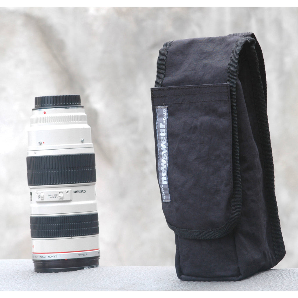 The Telephoto Press Pouch from Newswear is designed to hold most 70-200mm f/2.8 or 80-200mm f/2.8 lenses. The exterior material is water and stain-resistant 420D Crinkle Nylon. The touch fastened flap and interior lining contain 1/4" impact foam that help protect your gear from bumps and abrasions. The flap also features an exterior accessory pocket for small items, memory cards or film. The rear contains a belt loop. Spot cleaning is possible using warm water and a cloth.