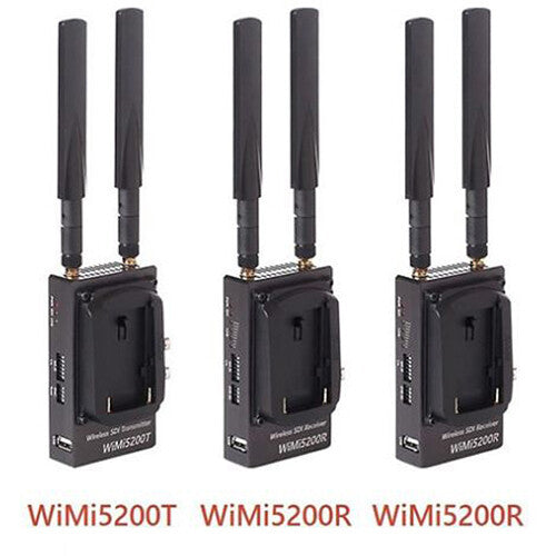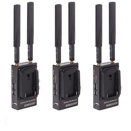 Wirelessly transmit high-quality HD video up to 1080p60 up to 1968' away using a 5 GHz Wi-Fi signal with this WiMi5200A Wireless Transmission System Bundle from Nimbus. The bundle includes one WiMi5200 3G-SDI H.264 encoder transmitter and two WiMi5200 3G-SDI decoder/receivers.