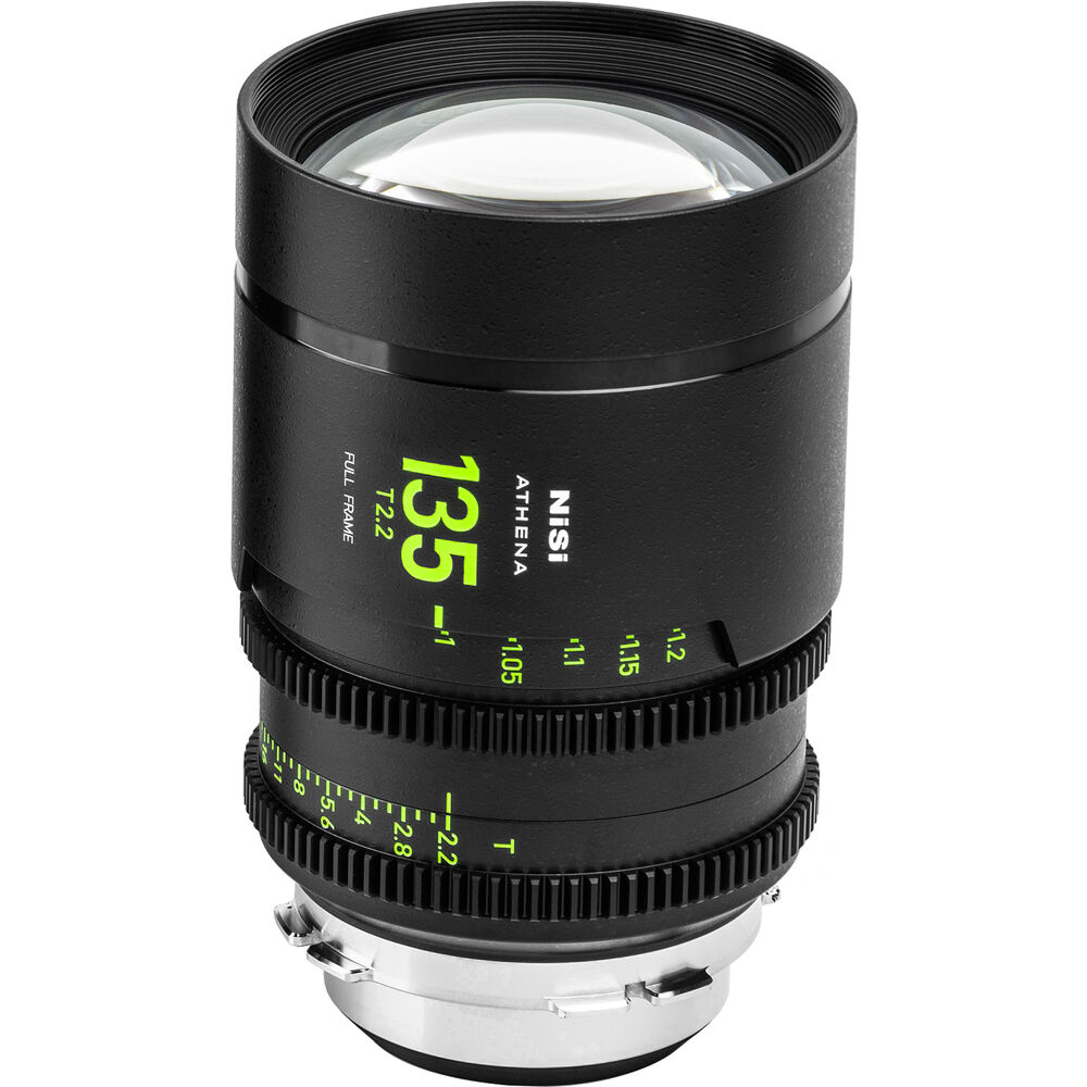 NiSi ATHENA PRIME 135mm T2.2 Full-Frame Lens. This lens features soft bokeh, micro-contrast control, and low chromatic aberration to highlight image details without distortion. It has a 46mm image circle, a T2.2 maximum aperture for deep depth of view and an increased area of focus, an 80mm front outside diameter, and minimal focus breathing.