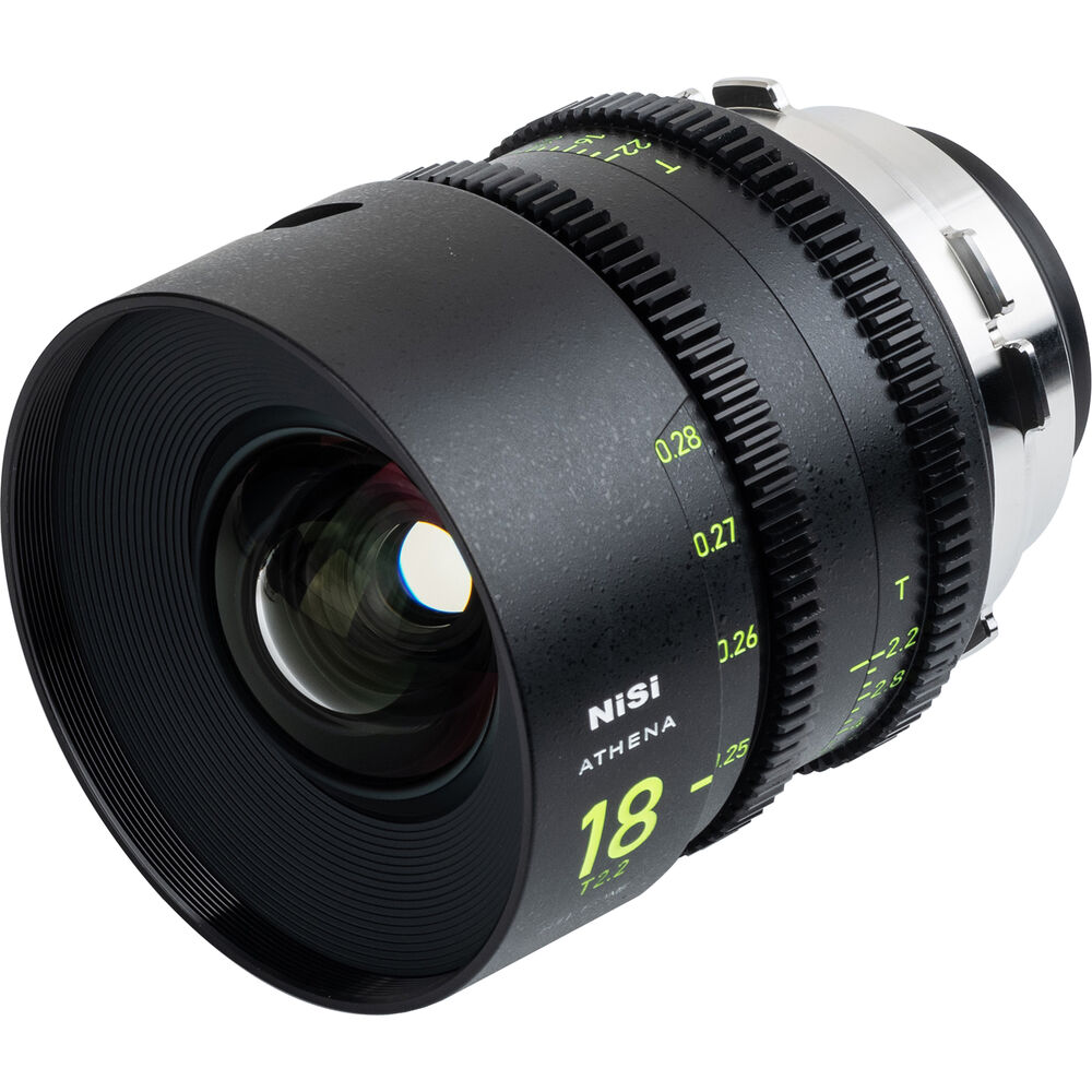 NiSi ATHENA PRIME 18mm T2.2 Full-Frame Lens. This lens features soft bokeh, micro-contrast control, and low chromatic aberration to highlight image details without distortion. It has a 46mm image circle, a T2.2 maximum aperture for deep depth of view and an increased area of focus, an 80mm front outside diameter, and minimal focus breathing.
