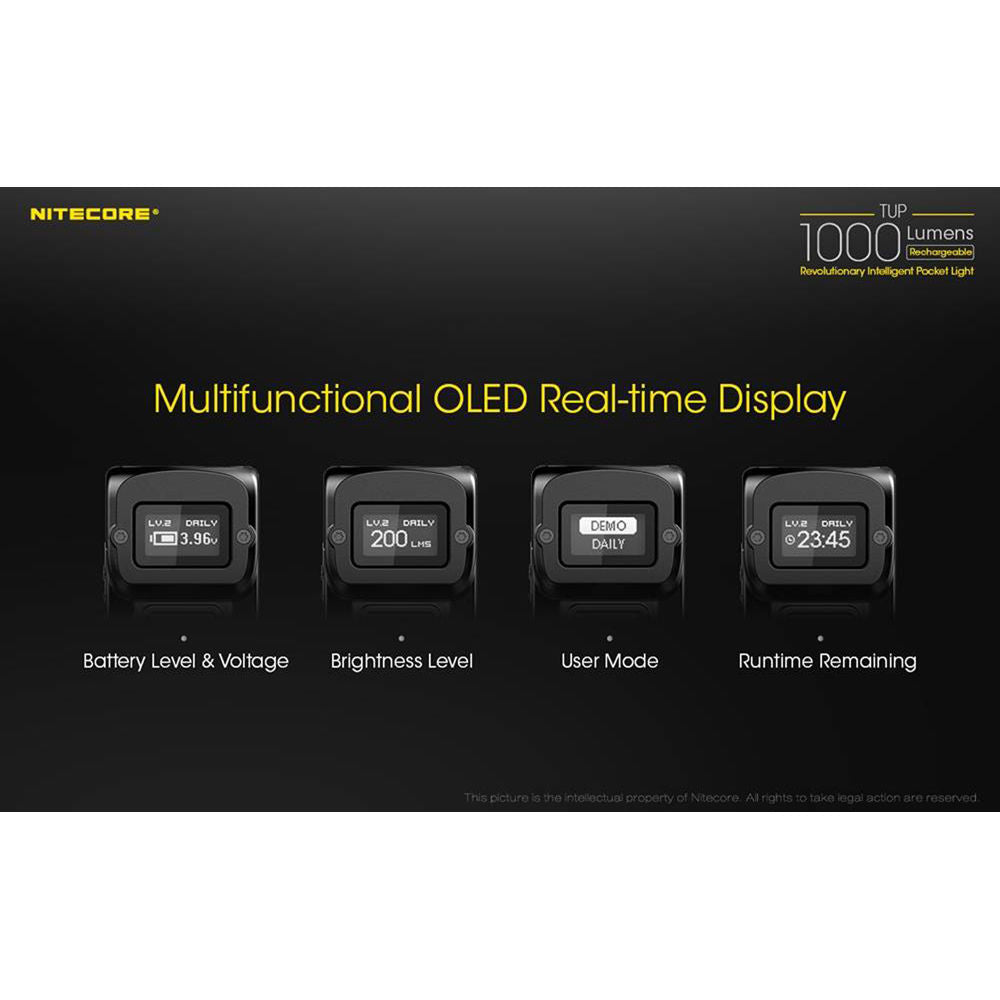 Designed for everyday carry, the gray Nitecore TUP Rechargeable Pocket Flashlight delivers big-light performance in a lightweight, compact package. Measuring just 2.8 x 1.2 x 1.0" and weighing less than two ounces, the TUP kicks out 1000 lumens on high power and will run for up to 70 hours on low. It has a total of five brightness levels, and you can go straight to turbo or low from any setting by pressing and holding the mode or power switch, respectively. Lumen output, battery level, and remaining runtime are shown on an OLED display.