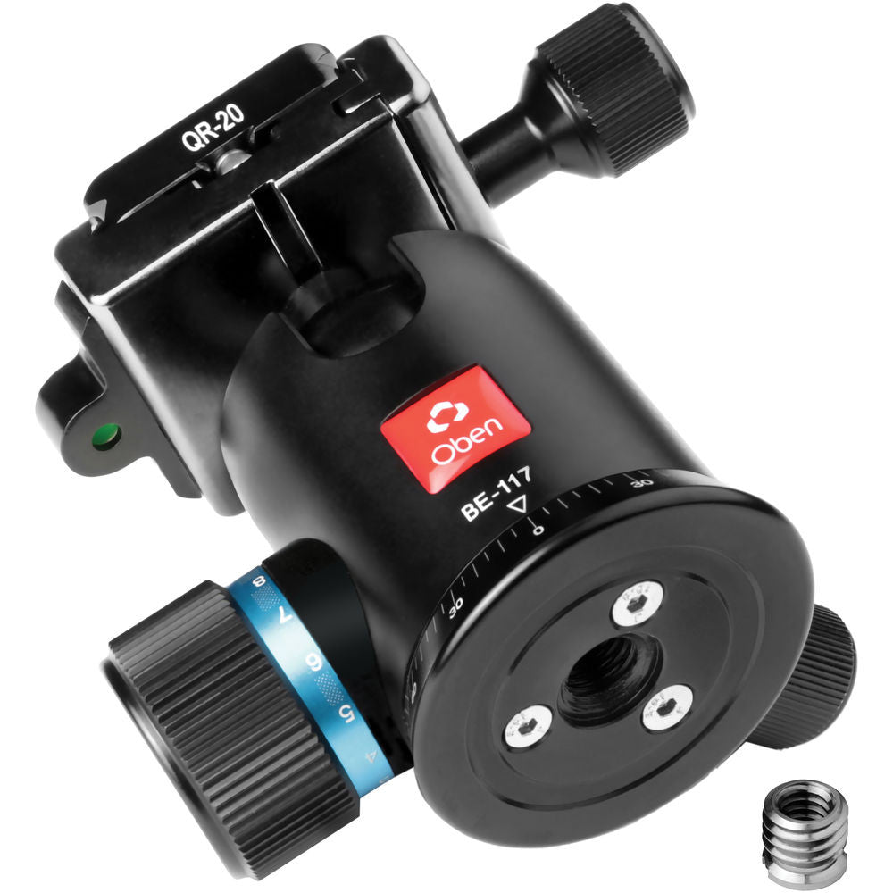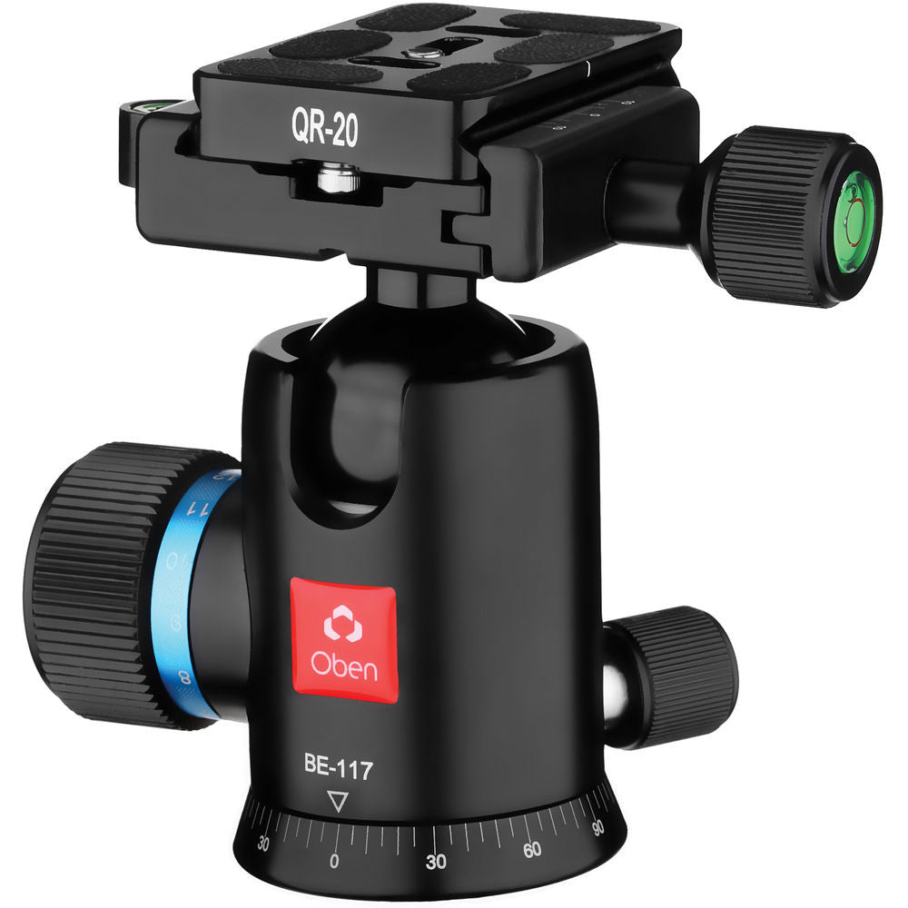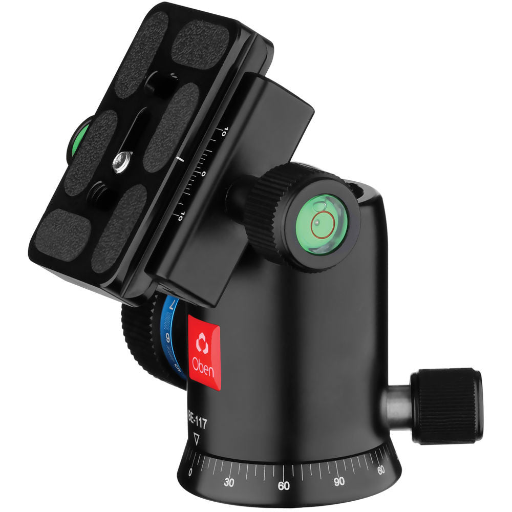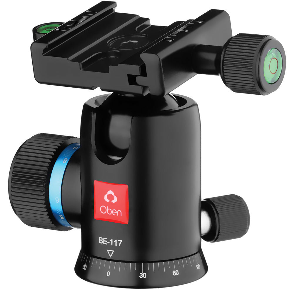 The BE-117 Ball Head from Oben is a lightweight aluminum ball head that features an Arca-type compatible quick-release system. It has a large locking knob to control the movement of the ball, and a separate knob for the 360° panning movement.