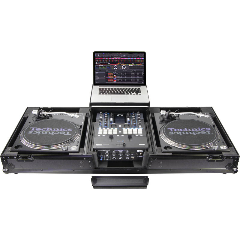 The all black Odyssey Innovative Designs Low Profile 12" Format DJ Mixer and Two Battle Position Turntables Flight Coffin Case with Wheels and Glide Platform is a full-featured, heavy-duty case for a two battle-style turntable and 12" mixer setup, offering protection from on-the-road wear and tear. The durable case is made from 3/8" laminated plywood and offers professional features including a gliding laptop platform, integrated recessed wheels, heavy-duty ball corners, recessed handles and latches, cable management side and bottom ports, and removable V-cut front access panel for the mixer section. The turntable coffin can accommodate Technics as well as Numark, Pioneer, Stanton, and other sized turntables.