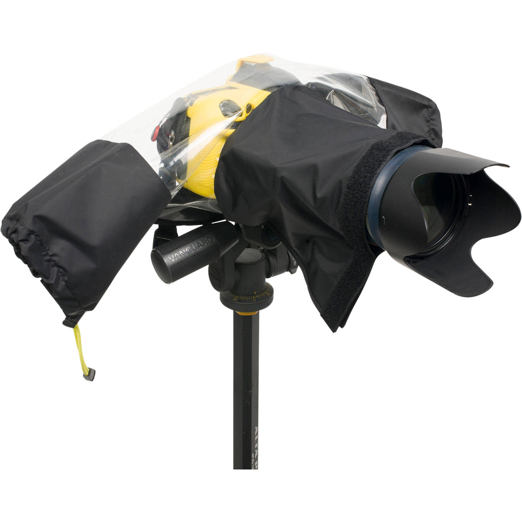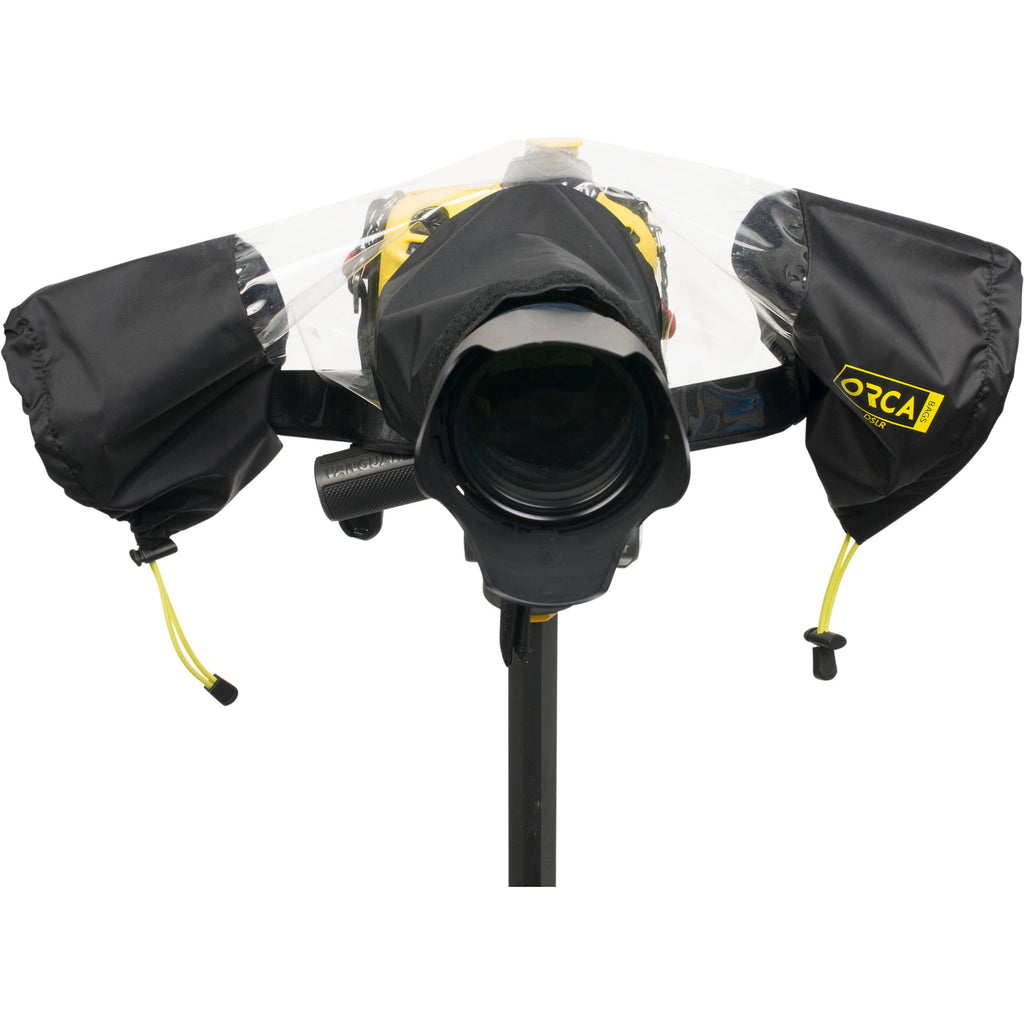 Sometimes you need to shoot even when the weather in less than ideal, but with the Orca Bags DSLR Rain Cover, you can get the job done and protect your gear from the elements. It is designed for comfort and ease of use. A nylon sleeve with drawstrings can be cinched around your forearms so you can grip your camera and keep rain and dust out. The body is clear plastic to give you unrestrained visibility to your camera's controls, dials, buttons, and screen. A lens cover and the included extension sleeve allow you to achieve a tight fit even on longer lenses like a 70-200 zoom with the ability to still set your camera on a tripod. The nylon sleeves and plastic body are all waterproof for maximum protection.