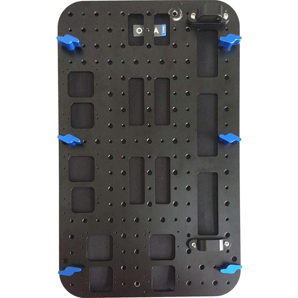 Two V-mount battery plates are included and attach to the large plate, each offering a D-Tap port. Also, two brackets come secured on the large plate to support the Easyrig Minimax skeleton. One bracket is on the top right and the other on the bottom right. When they're not used for the Minimax, the brackets can be used for cable management.