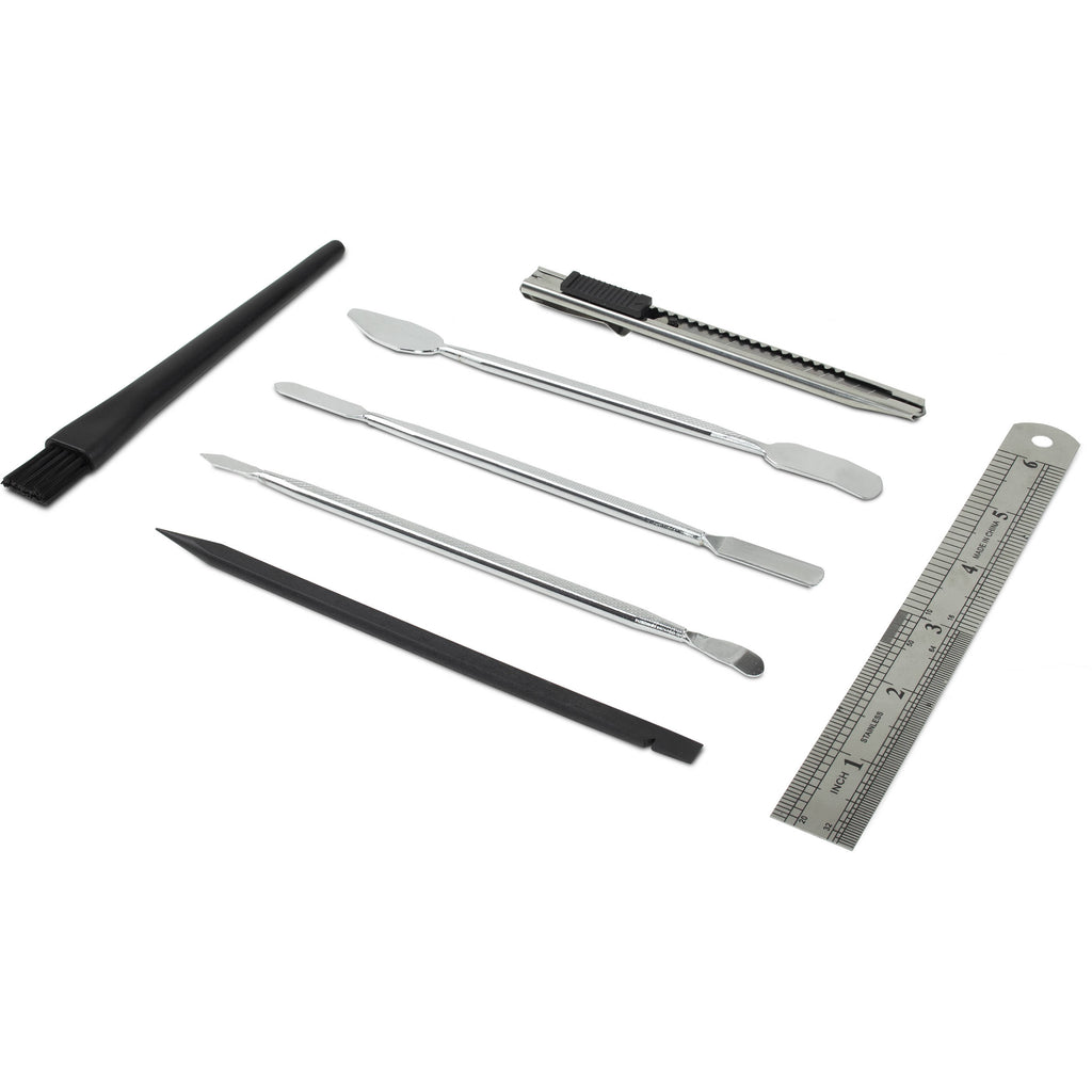 - The set includes 58 interchangeable bits, a utility knife, an anti-static wrist strap, anti-static tweezers, a SIM card ejector pin, an LCD suction cup, a triangle plectrum, plastic and metal spudgers, a stainless steel ruler, a cleaning brush, and a telescopic flexible shaft (adjustable to four different lengths and a variety of angles) that can help you access hard-to-reach screws.