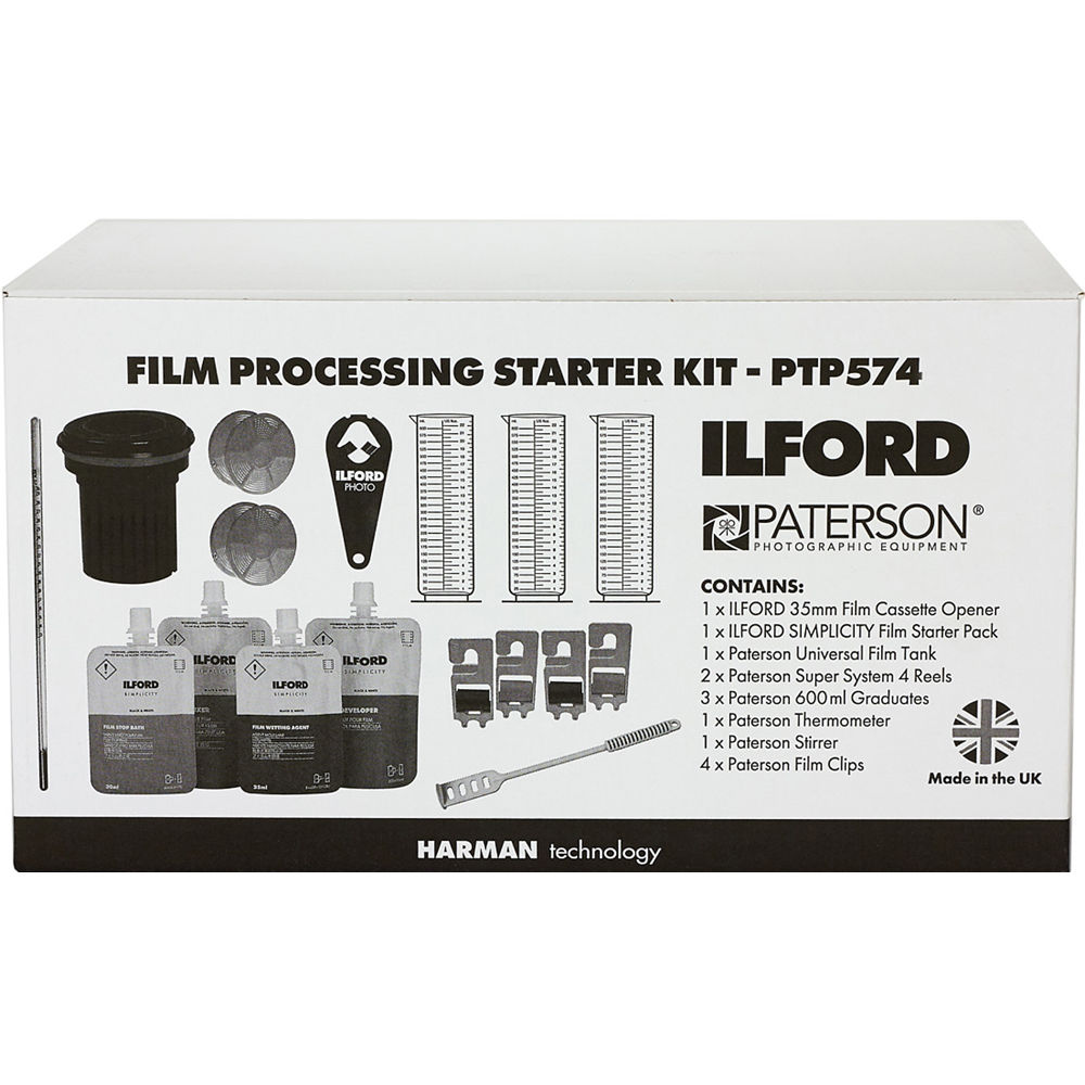 Begin developing your own black and white film with the Film Processing Starter Kit from Ilford and Paterson . Comprising everything you need, this kit includes an Ilford SIMPLICITY Starter Pack of developing chemicals, a 35mm cassette opener, a Paterson Universal Developing Tank with two reels, a thermometer, three 22 oz / 600mL graduates, a mixing stirrer, and two sets of film drying clips.