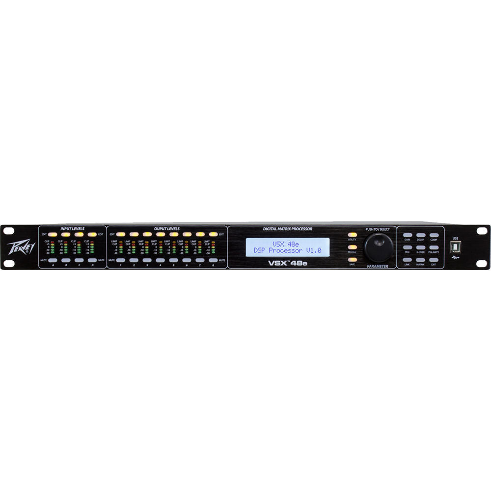 The Peavey VSX 48e is a 1 RU programmable loudspeaker management system designed to provide flexible routing, powerful DSP, and convenient remote control for audio engineers and system designers in concert venues, houses of worship, clubs, and theaters. It features four balanced XLR inputs and eight balanced XLR outputs; any input can be routed to any output.