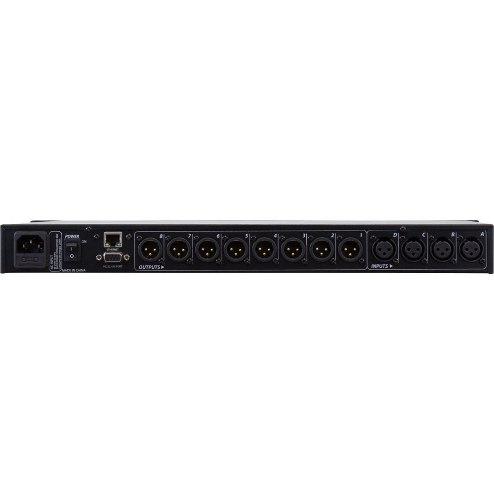 Every input offers gain, mute, high- and low-pass filters, 8-band parametric EQ, polarity, and up to 680 ms of delay. Every output features gain, mute, crossover/band-pass filters, 9-band parametric EQ, polarity, up to 680 ms of delay, and a compressor/limiter. 5-segment LED meters for all inputs and outputs are visible on the front panel, regardless of the current menu selection. A built-in signal generator provides sine, white noise, and pink noise for various alignment and testing procedures. Store and recall up to 30 custom configurations via the user preset bank.