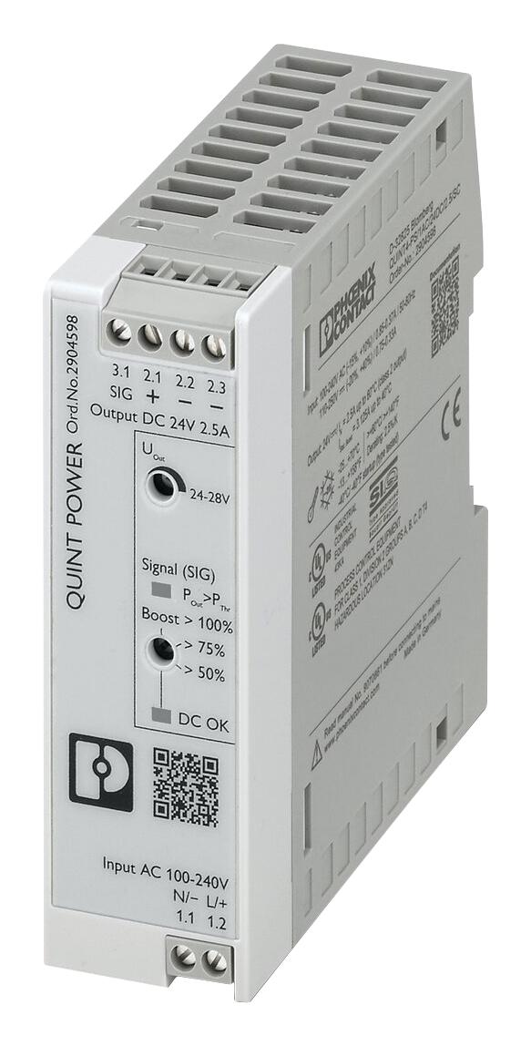 2904598 is a QUINT4-PS/1AC/24DC/2.5/SC primary-switched power supply unit. QUINT POWER provides superior system availability in the smallest size. Preventative function monitoring and exceptional power reserves are available for applications in the low-power range. Certified by EN 61000-3-2, IEC 61010-2-201 (SELV), IEC 61010-1 (SELV), IEC 61010-2-201 (PELV), IEC 61558-2-16 IEC 61010-2-201, IEC 61010-1, EN 61558-2-16, EN 61204-3, UL Listed UL 61010-1, UL listed UL 61010-2-201, ANSI/UL 121201 Class I, UL 1310 class 2 power units.