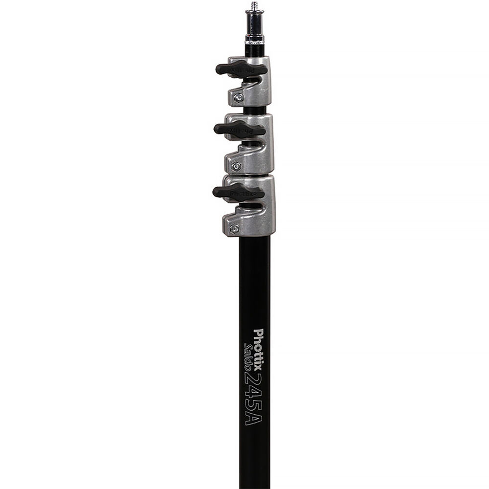 The Saldo 245A Air-Cushioned Automatic Collapsible Light Stand from Phottix is 8.0' tall and has a 6.6 lb load capacity. The air-cushioned column is made up of four aluminum sections with locking knob joints. The top of the stand has a standard 5/8" mounting stud with a 1/4"-20 threaded tip. Simply set the Saldo 245A down, and the legs extend automatically; lift the stand, and the legs automatically return to the folded position.