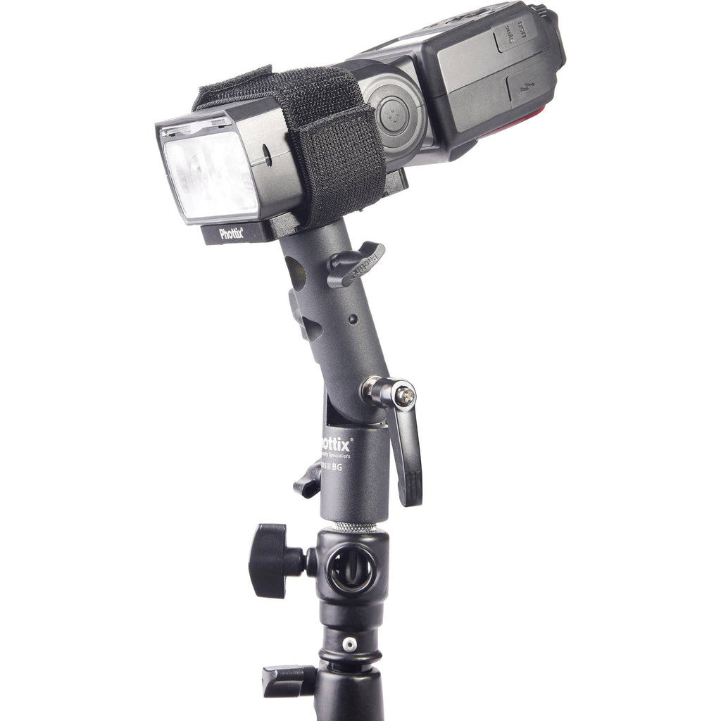 The Varos H-Mount Plate and Strap from Phottix is a handy, space-saving way to stand or swivel mount your shoe-mount camera flash. An adjustable padded strap holds the flash flat to a non-skid rubberized platform attached to a 3/4" long, 5/8" diameter stud with reversible 1/4"-20 / 3/8"-16 thread. The stud fits perfectly inside an umbrella-type stand mount and other accessories such as super clamps with a 5/8" receivers. The male threads offer additional mounting options. Among the benefits of this type of mounting are better center of gravity for the flash, zero likelihood of snapping the flash shoe and easier centering of the flash inside a softbox or umbrella.