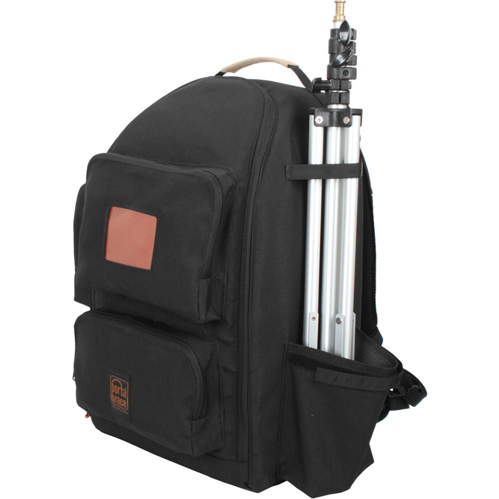 Store, protect, and transport your camera and accessories with the black Backpack with Semi-Rigid Frame for Sony NX5R from Porta Brace . This backpack is designed to hold a Sony NX5R camera, and may also be used as a sling bag. For protecting and organizing gear, the pack has a padded, touch-fastening interior divider. Under the zippered lid to the spacious main compartment are clear pockets for storing slim accessories such as filters, cables, and the like. And on the exterior are zippered pockets for batteries and other larger peripherals. Photographers will appreciate the useful side pocket for holding the base of a small tripod, light stand, or other support gear. An adjustable strap above this pocket secures the midsection of the tripod.