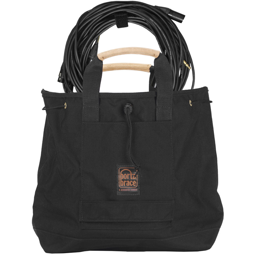 Organize and transport your cables with the large Porta Brace Cable Tote Bag . This cinch-style bag is lightweight, and manufactured from durable 1000-denier Cordura with a coating that renders the bag water resistant. Foam padding along the bottom of the bag helps prevent damage from impact with hard floors. For comfort, the nylon handles are covered in soft brown suede. Two pockets and an included soft zippered pouch can be used to store small essentials and accessories.