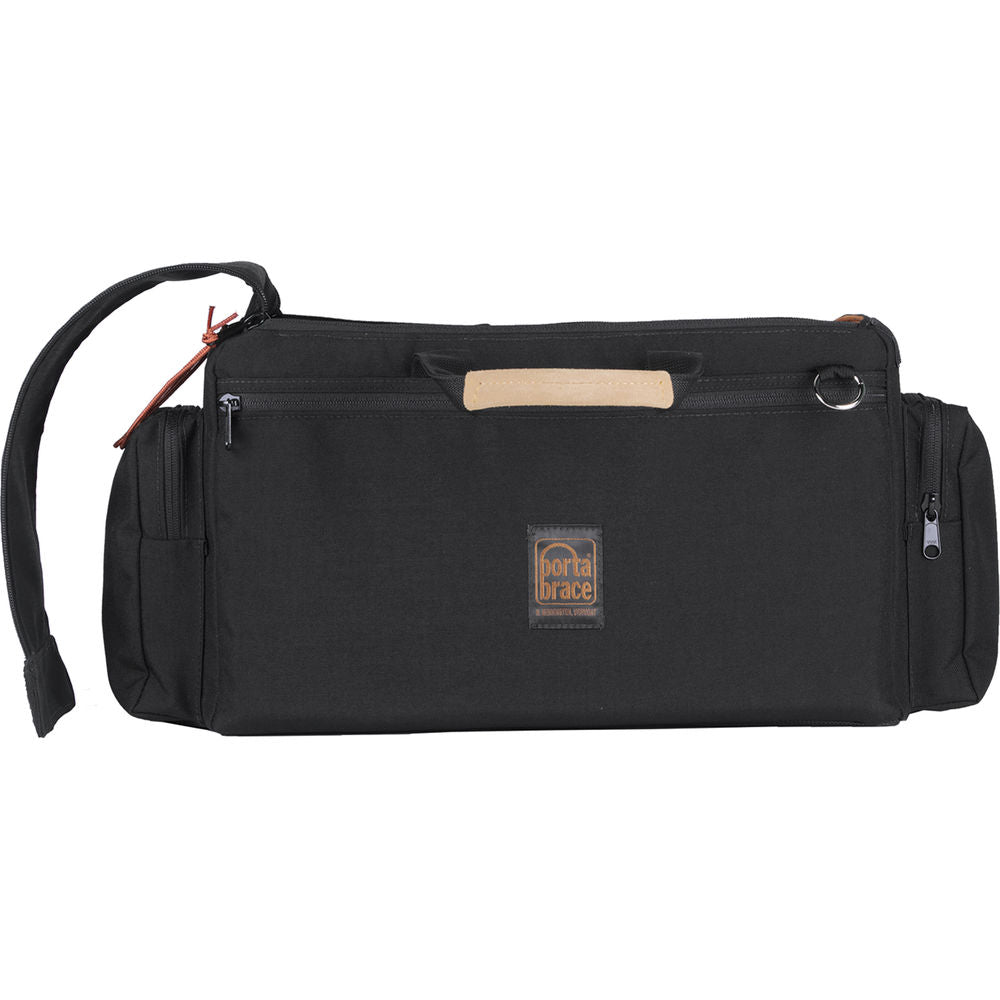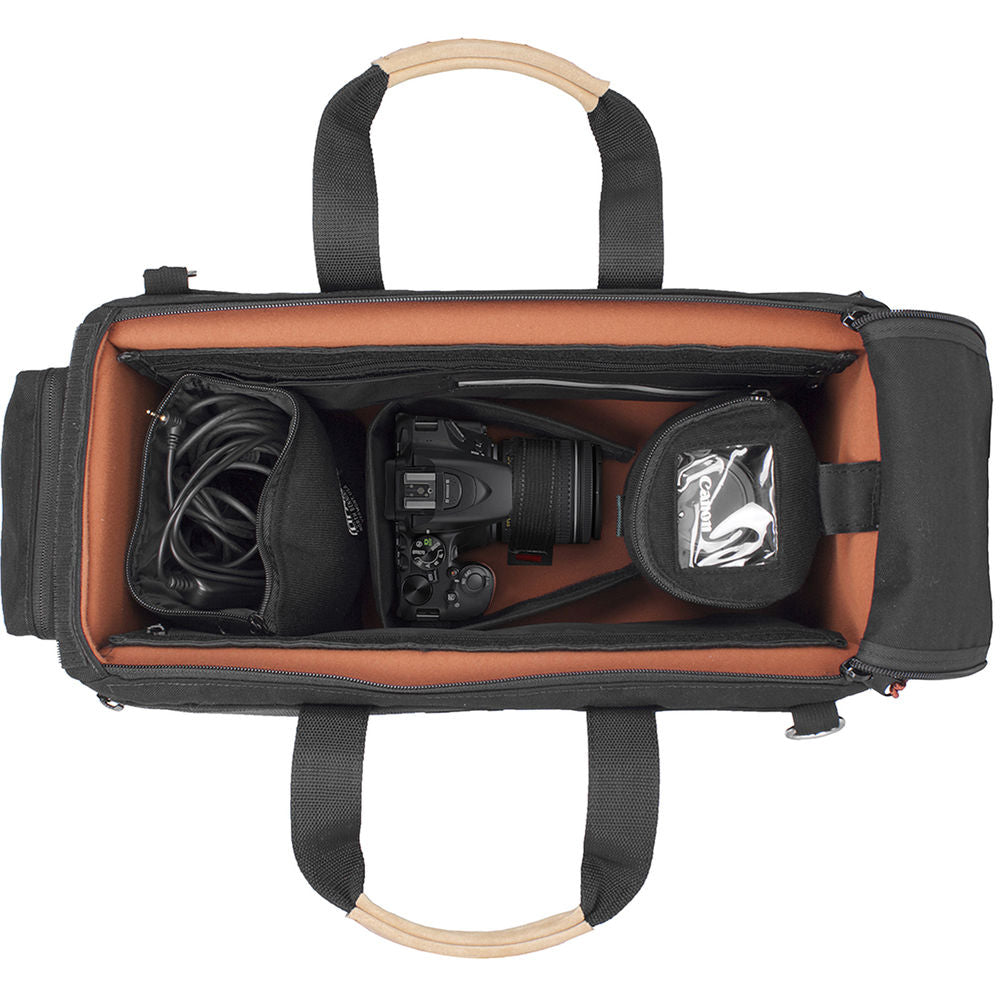 The black Cargo Case Camera Edition for DSLR Kit from Porta Brace holds a DSLR, lenses, flash, and accessories, or a fully assembled professional video camera that is up to 16.5" long in the 9" tall main compartment. For storing more gear, the case features two exterior padded side pockets, two front and back exterior flat zippered pockets, and two front and back interior slip pockets.