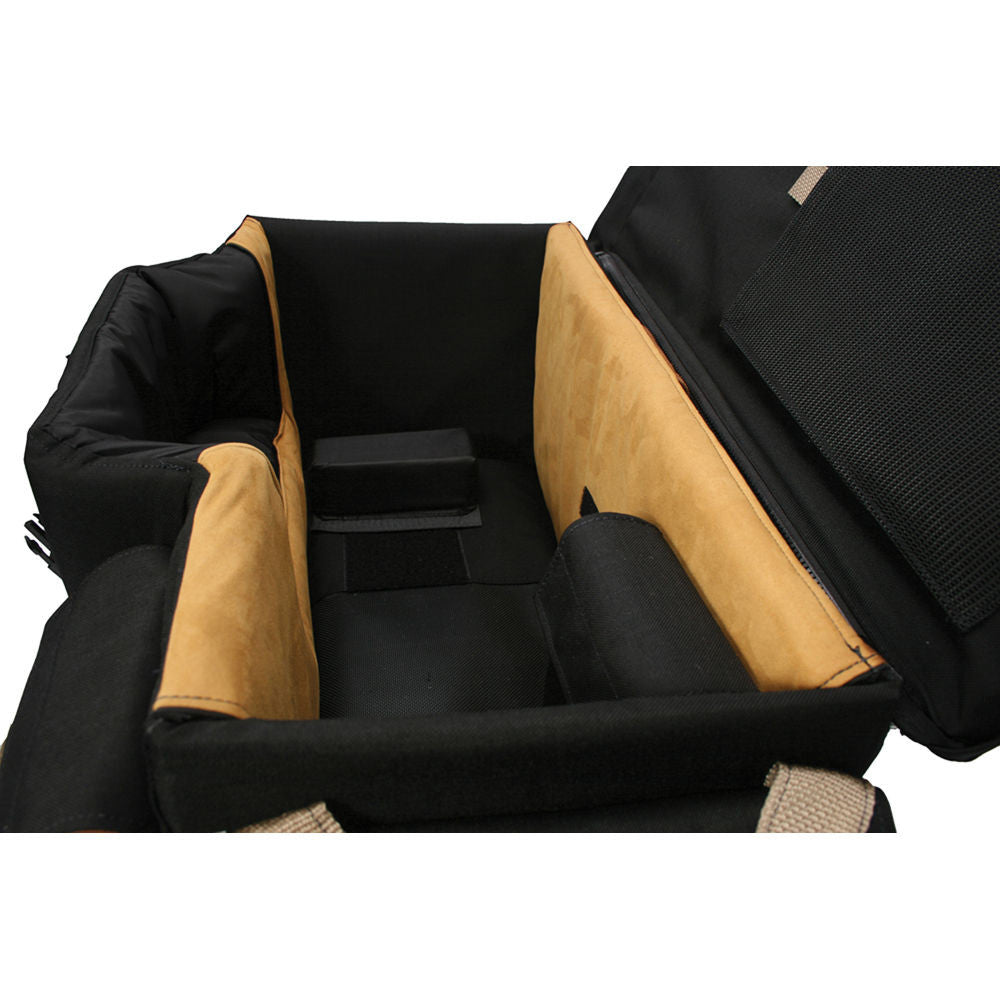 The case holds a camcorder with an on-board battery and most wireless configurations attached. The flared-wall design accommodates matte-boxes and large lenses so time is saved by not having to take these items off each time the camcorder is placed in the case. For extra long lenses there's even a zippered Camera-Extension Pocket on the side of the case that, when deployed, adds up to 3.0" to the interior length of the case.