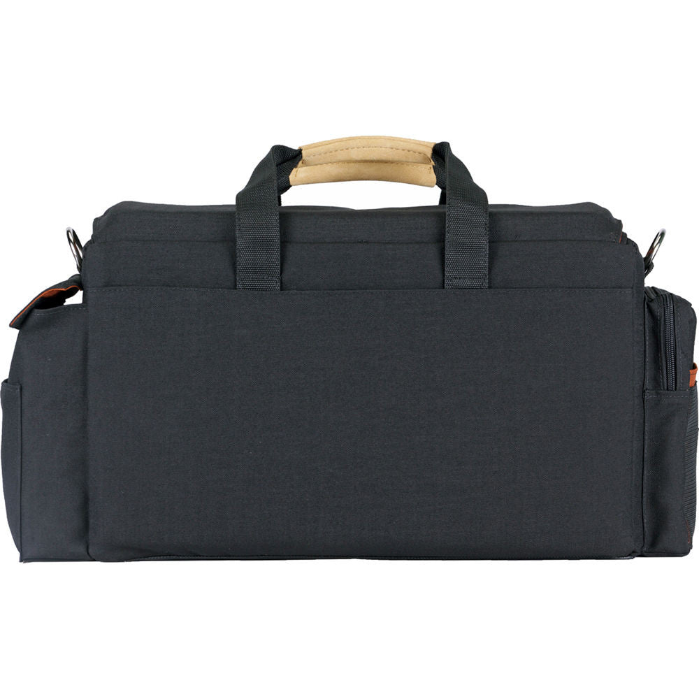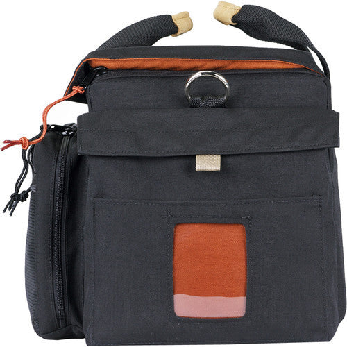 The black with copper trim DVO-2 DV Organizer Camera Case from Porta Brace is designed to hold compact Mini DV camcorders and accessories. It is made from 1000 denier Cordura fabric with a new, slip-resistant, easy-clean rubber bottom. It holds the camera with a universal cradle and a camera tie-down strap. There is a soft stuff pouch to keep the camera stable. A plush, 1.0" thick foam pad adds extra stability and protection.