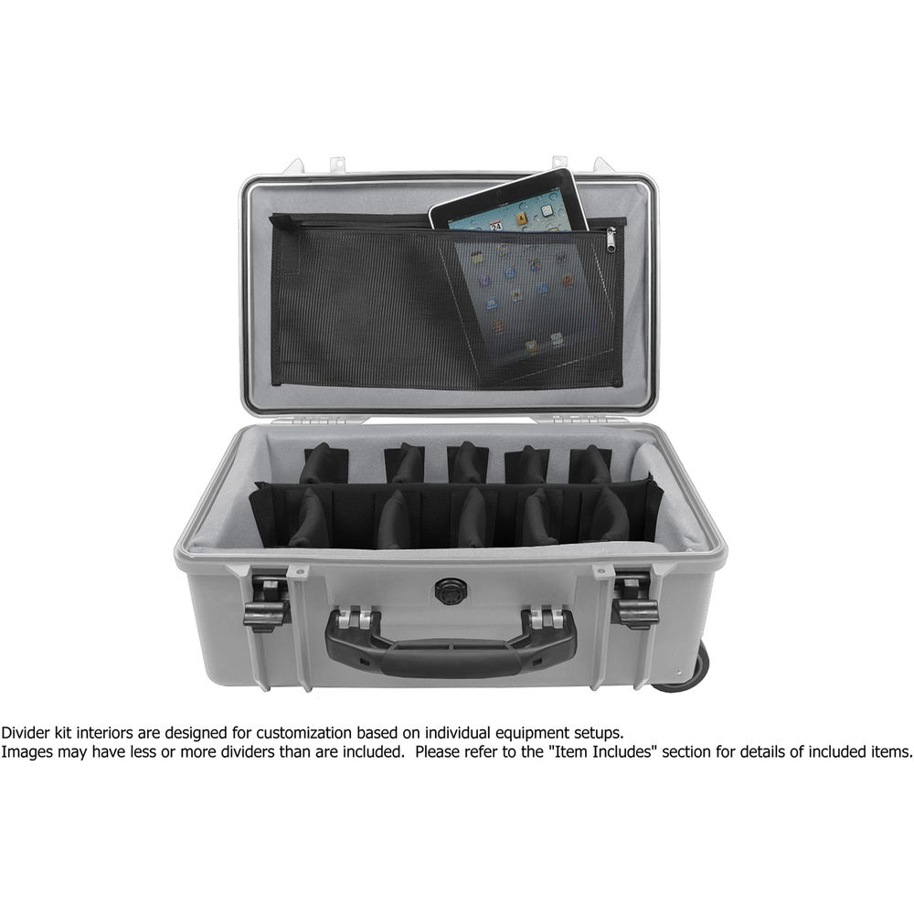 The silver platinum PB-2550 Hard Case with Divider Kit from Porta Brace is a watertight, high-performance hard resin case you can use for transporting and protecting video, audio, and photographic equipment. The case has rigid grip handles, a retractable handle, and built-in wheels. The divider kit includes six 5x3" dividers, two long dividers, one padded iPad pouch, and one small pillow.