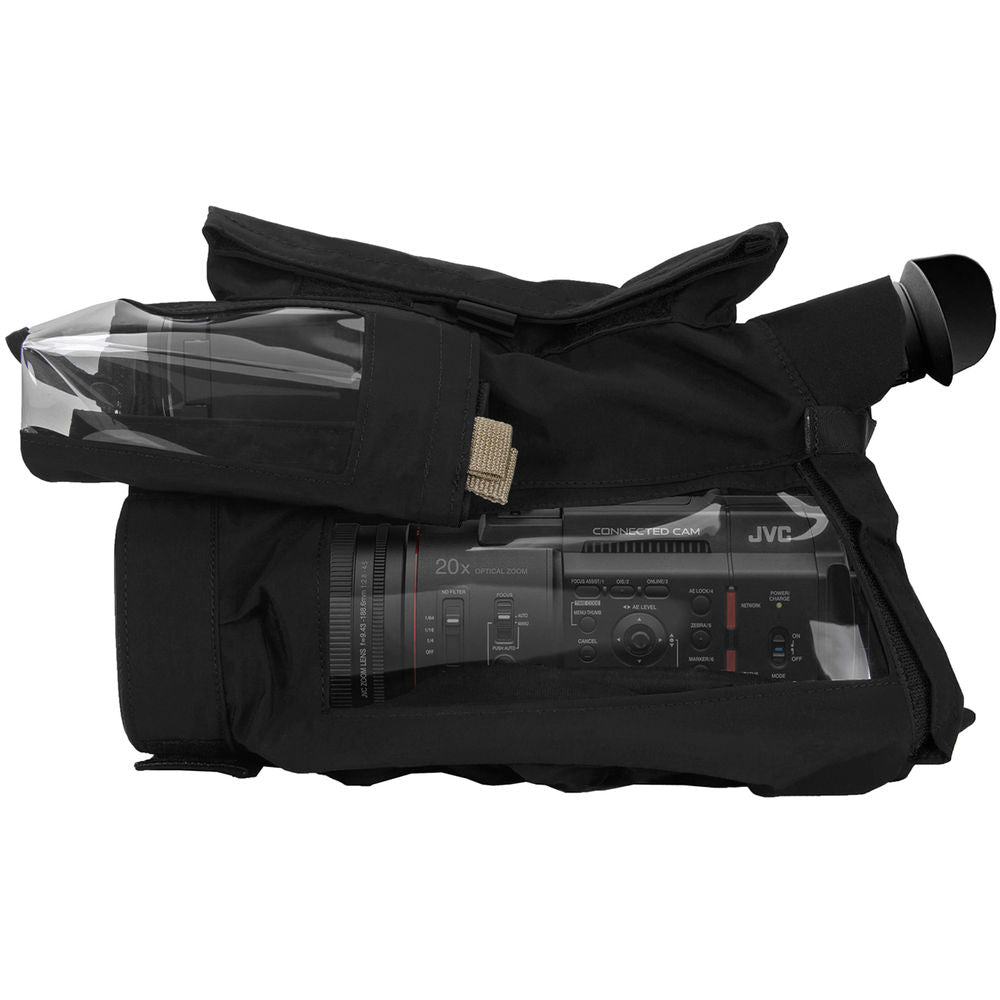 The Porta Brace Rain Slicker for JVC GY-HC500 is a custom-fit protective cover designed to keep rain and dust off your camera. It is made from nylon Taslan material with soft tricot-backed lining, and features two clear vinyl windows for viewing the fold-out screen and camera controls. The front visor is detachable, and a triple-zippered bottom allows you to use the cover with or without a tripod. For added convenience, a touch-fastened sealed rear flap allows for easy battery changes.