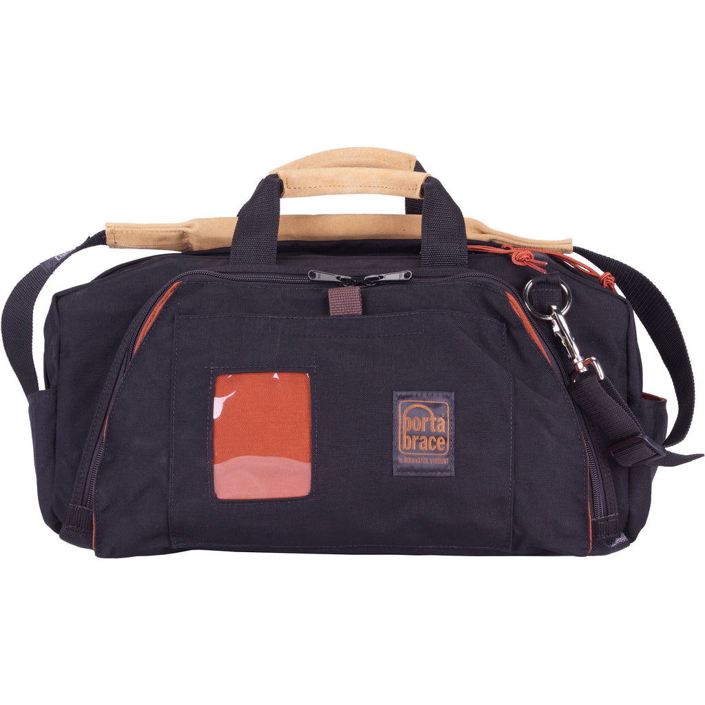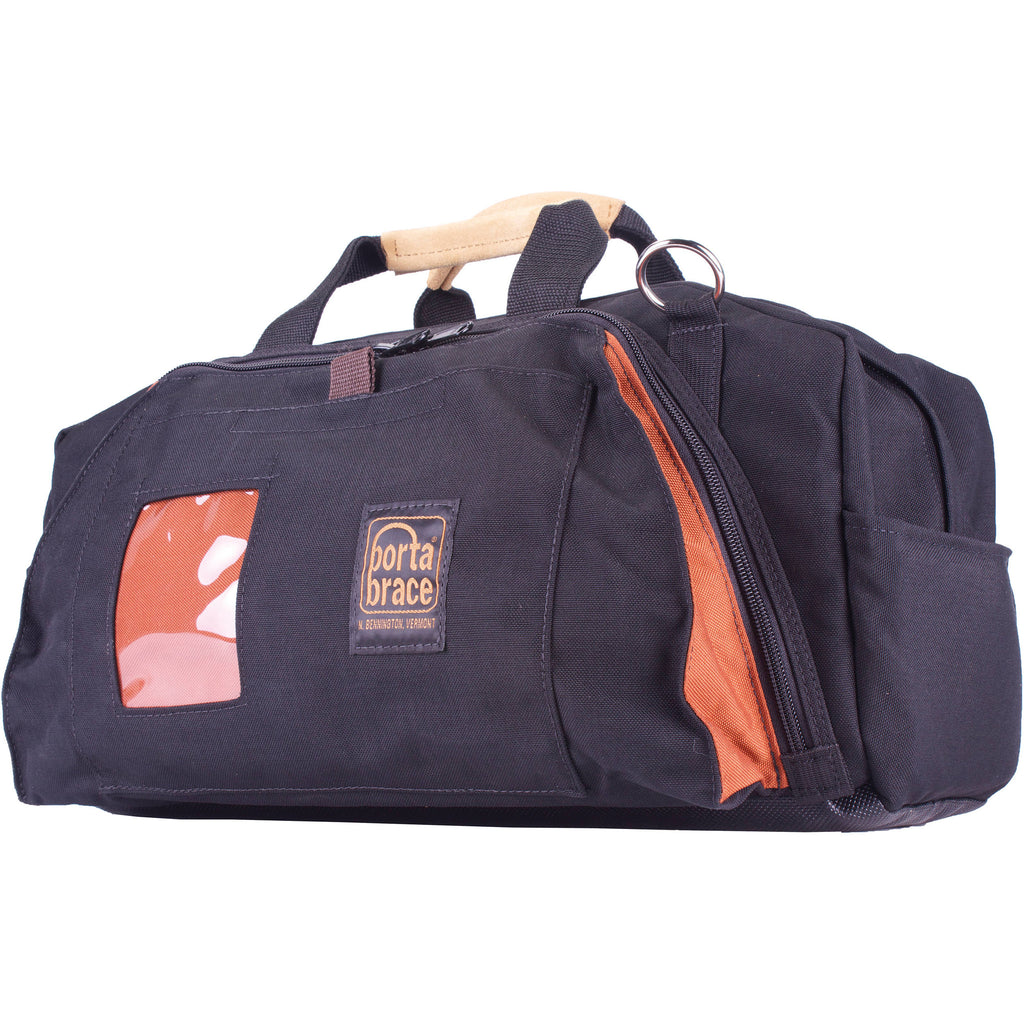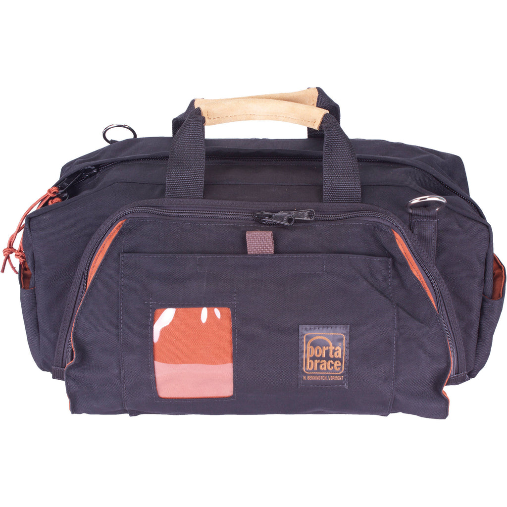 The Porta Brace RB-1 Lightweight Run Bag, Small (Black) is designed for news and production crews. The bag stores spare tapes, batteries, cables, microphones and other audio/video accessories. The main compartment is foam padded, with a padded rigid bottom. Two sewn-in dividers span the 7.0" width with a 12" divider in between. The long divider has a zippered slip pocket. On the outside there are two large zippered compartments for cables or other items. Fold them out of the way for one large compartment.