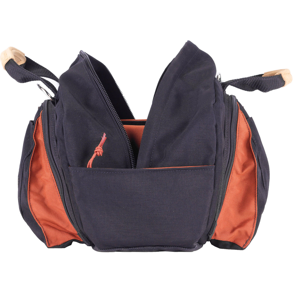 - Two dividers are sewn into the bag on one side and they hinge and attach to the other side; this creates a center compartment.