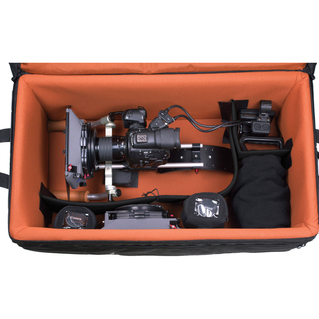 The Porta Brace RIG-4SRKOR Wheeled Rig and Camera Case with Interior Kit is designed to carry cameras and camera rigs up to 29.5" long fully assembled or with minimal disassembly of the rig components. Suitable for mid-size rigs like the Zacuto Fee-N-G or Redrock Micro ultraCage (sold separately), this large and flexible case is durable and complete with accessory items to hold your gear safely and comfortably in place. The case is made from rugged 1000-denier Cordura and features 1� thick padding surrounding a hollow-core plastic frame. The bottom is bolstered by a layer of waterproof rubber to assist with ground protection. It is carried by two top suede leather carry handles or a removable suede leather shoulder strap.