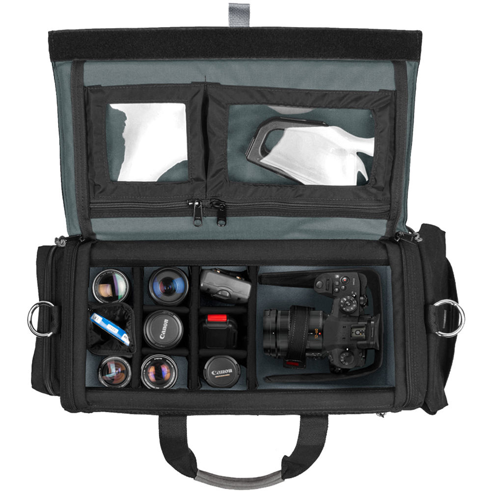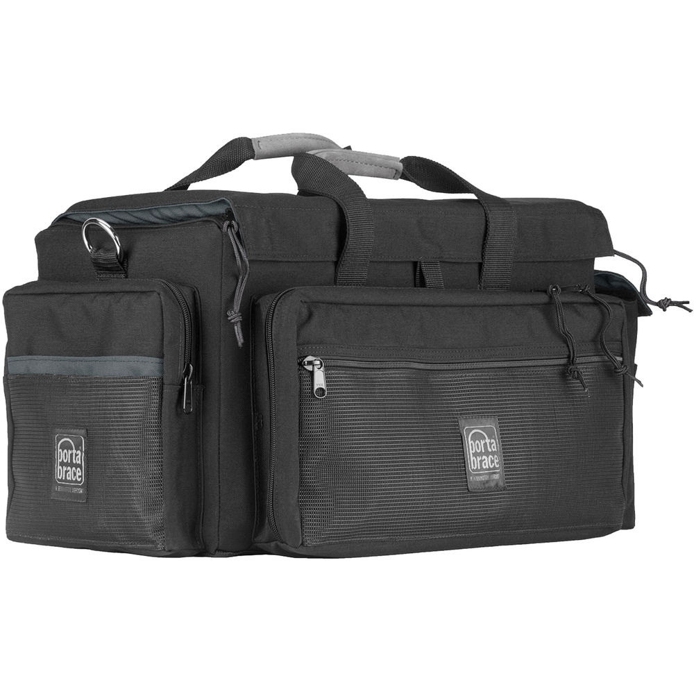 Holds DSLR, 3-4 Lenses, Accessories1000D Cordura Nylon Exterior1" Thick Foam InteriorRigid Plastic Walls The RIG-LUMIXDC Organizer Camera Case in black from Porta Brace is designed to hold a Pro DSLR or mirrorless camera with three to four lenses and accessories. It's constructed from 1000D Cordura fabric, with a plush, 1" thick foam padding, rigid wall frame, and anti-skid bottom. The case includes dividers, a cradle, a cinch, a white balance card, a carabiner flashlight, and a stuff sack. Carry the case with the suede-covered grip handles and adjustable shoulder strap.