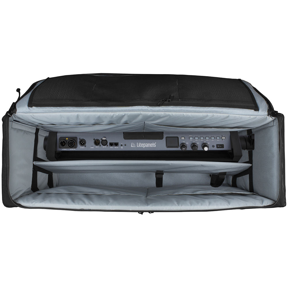 Store, transport, and protect a Litepanels Gemini light, yoke, stand, and related accessories (or up to two Litepanels Gemini lights alone) with the black Wheeled Carrying Case from Porta Brace . Fully-featured, the case has two tie-down power supply straps, an interior divider, and interior slip-in pockets. An exterior zip pocket is useful for holding cables and other gear. Carry the case with the removable leather handle or shoulder strap.