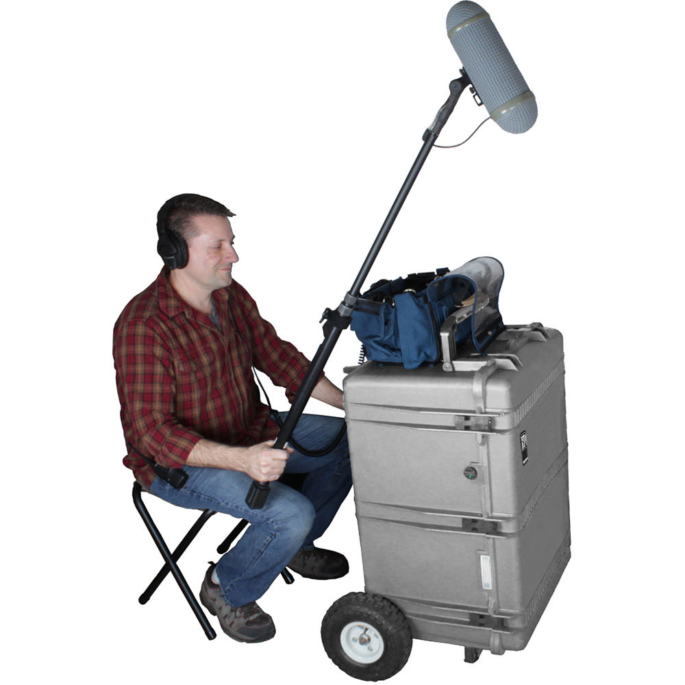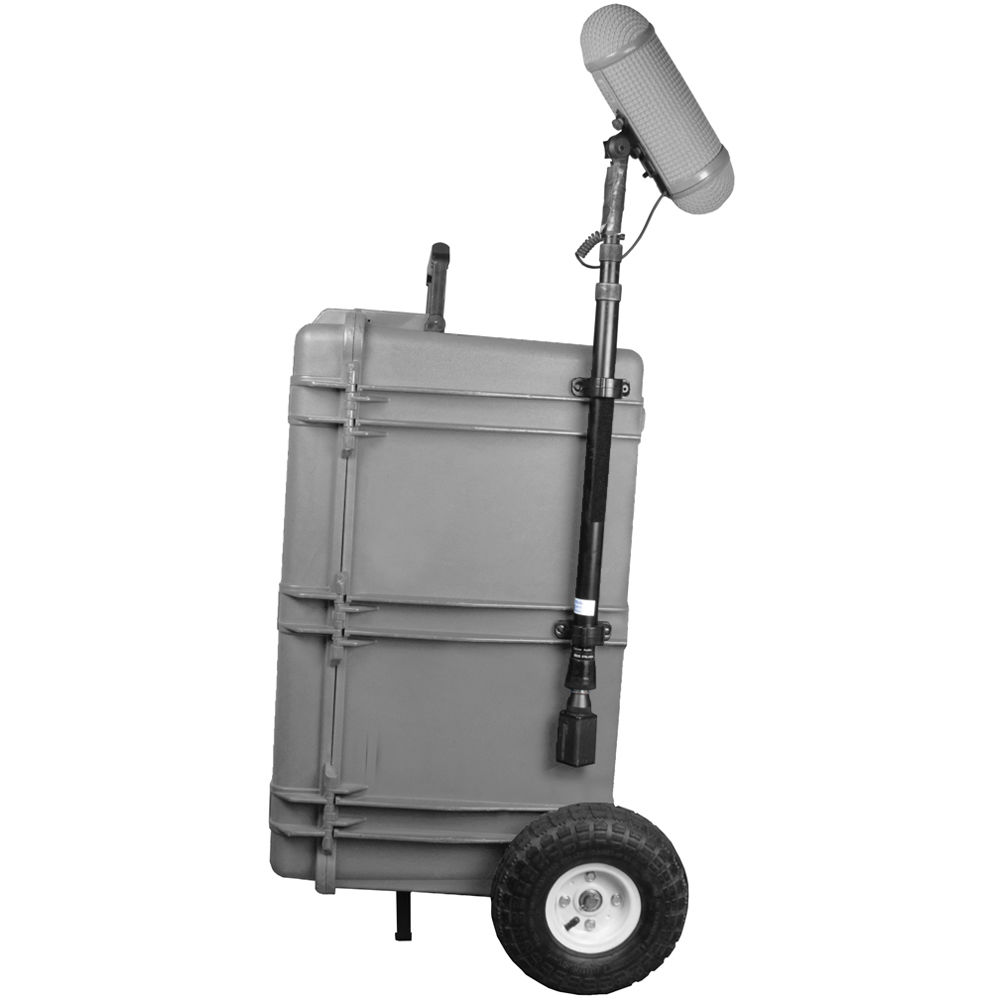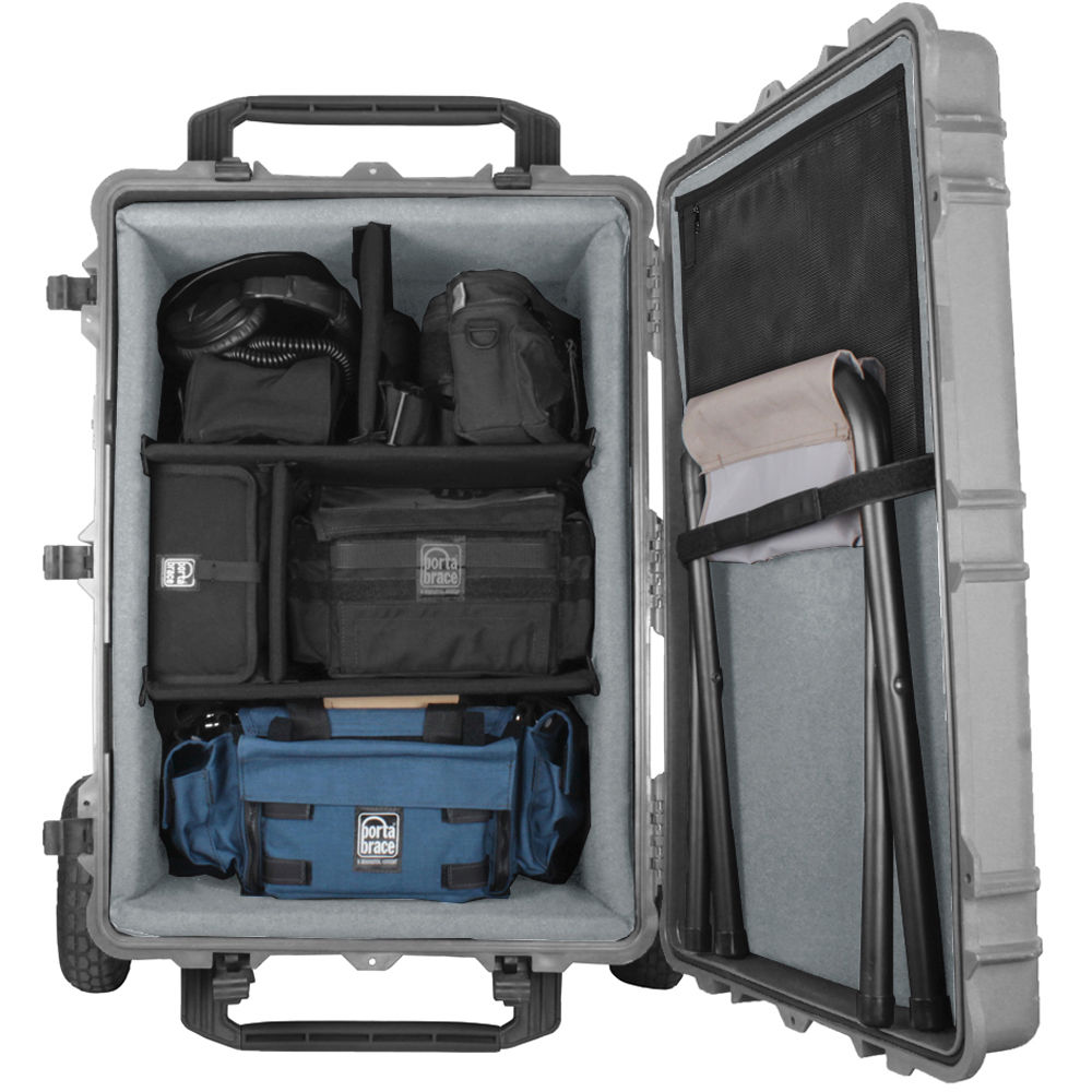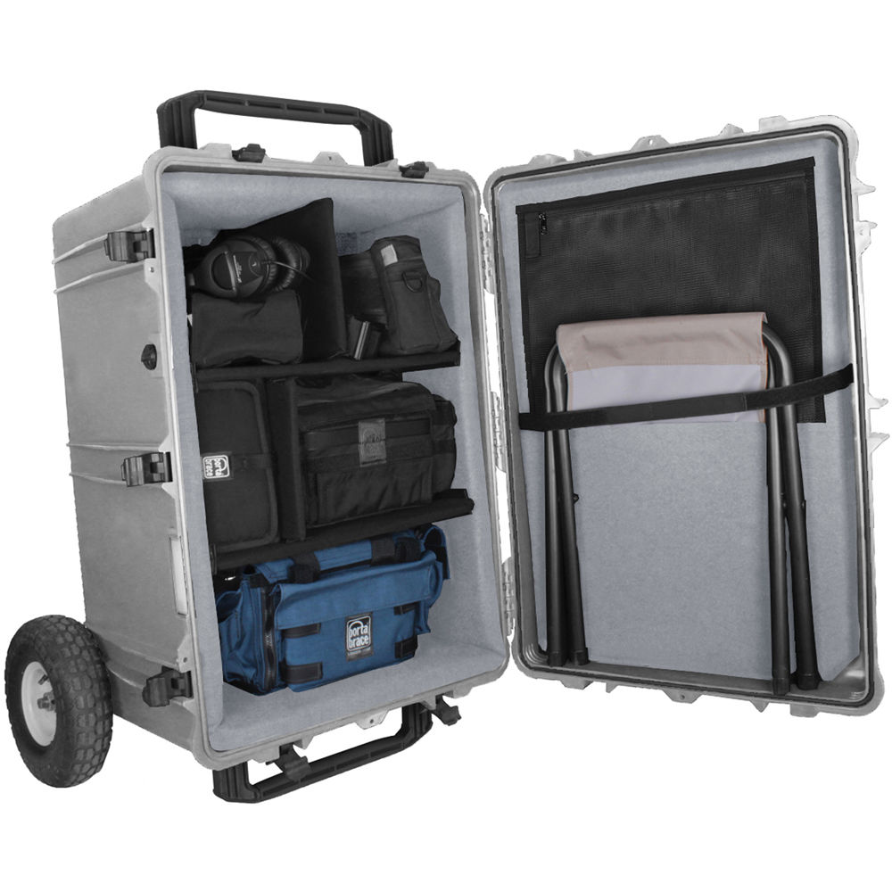 Go on location with your audio/video/photo gear with the platinum Wheeled Hard Case Mobile Audio Workstation from Porta Brace . This lightweight, crushproof resin case features large off-road wheels, padded touch-fastening dividers, and integrated boom pole clips. Users will appreciate the large handles, the latch closure, the inner zip mesh pocket, and the gear strap. The case can be used vertically or horizontally.