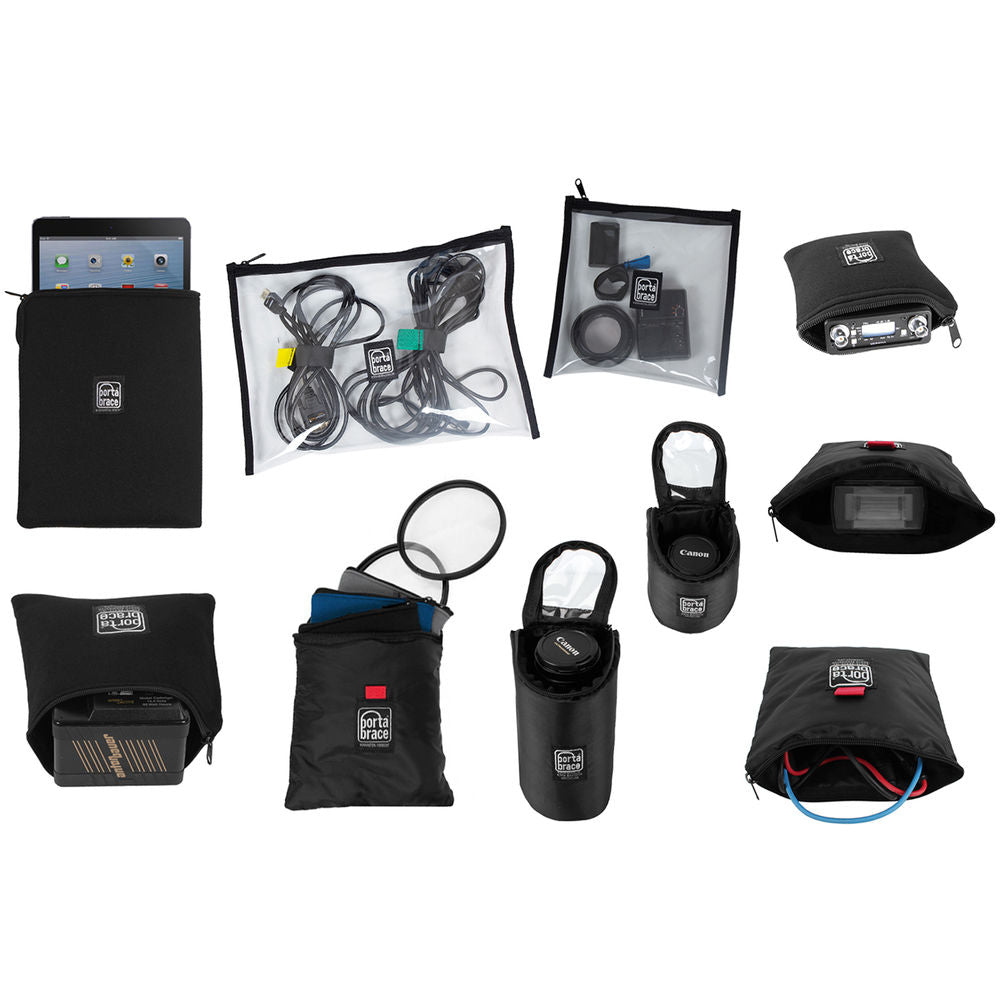 The Porta Brace 9-Pouch Set with Two Clear Pouches and Two Lens Cups features nine pouches that are good for carrying accessory odds and ends, as well as glass filters in the double-layer pouches. Two clear pouches are included and they allow you to see their contents at a glance, making them excellent choices for carrying around small items and accessories. The two included lens cups provide storage and protection for lenses or other sensitive items and are 4 and 7" tall.