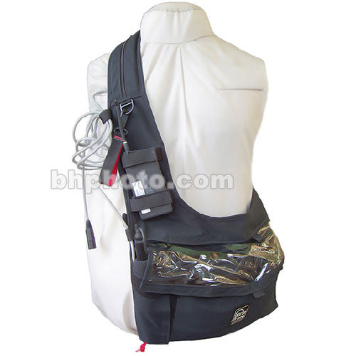 The Porta Brace SS-A1 Audio Side Slinger is a neat and trim way to carry a 2- or 3-channel mixer, supplemental battery supply, and wireless microphones. Using a combination of adhesive-backed touch fastener and small cinch straps, your mixer stays right where you need it. An area for NP1, IDX, Anton Bauer, and other similar-sized batteries is located just below the mixer area. At the top edge is a clear vinyl window, which unfolds to cover the equipment in rain, snow, or blowing dust. There is also plenty of space to accommodate wireless microphones. The included shoulder strap is adjustable, nicely padded, and nonslip.