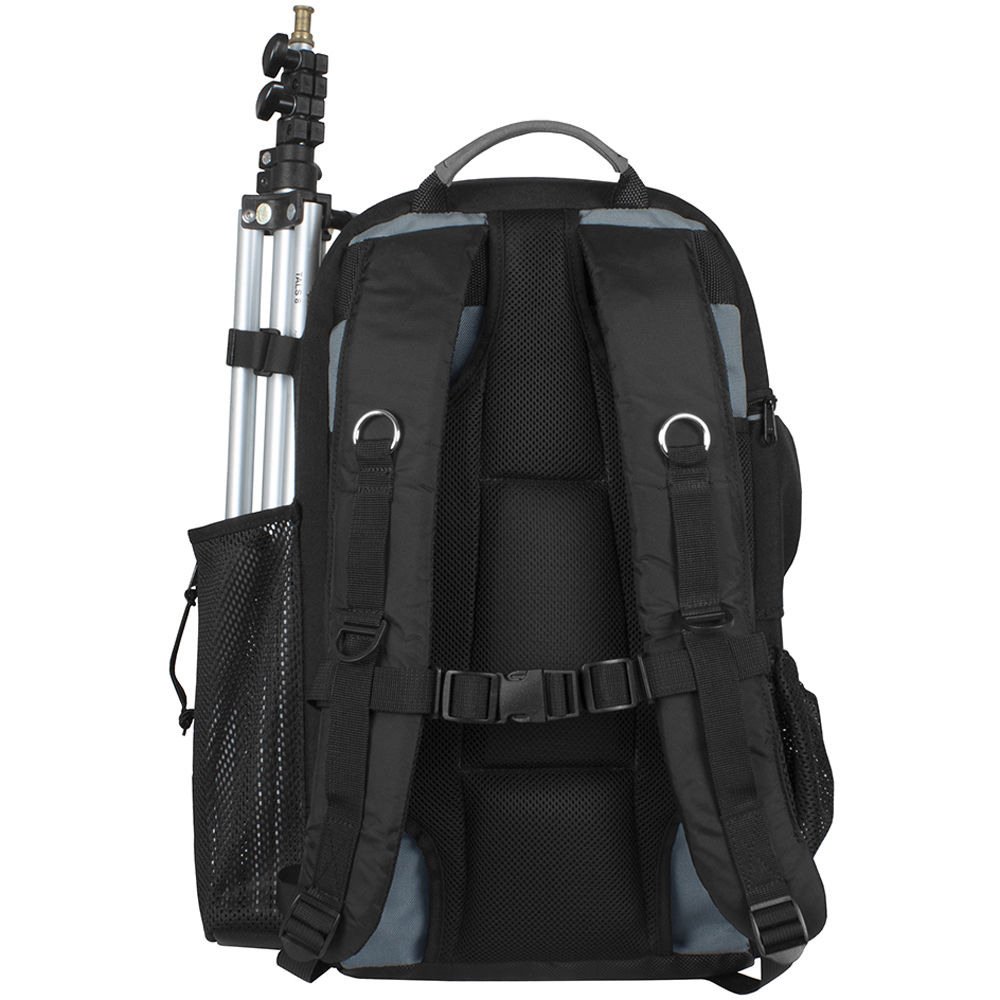 Features include a variety of interior and exterior accessory pockets plus an exterior side pocket with an adjustable strap for holding a compact tripod or stand. Carry the pack with the suede leather top handle, or wear with the padded, mesh-lined shoulder straps and connector. The back panel is padded for cushioning comfort and the shoulder straps may be neatly tucked away when not in use.